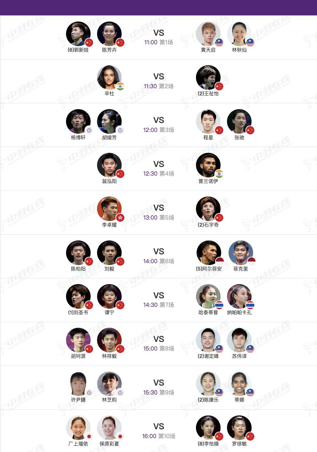 【2号场地】1、郭新娃/陈芳卉🇨🇳 vs 🇲🇾黄天启/林秋仙(2-0)2、王祉怡🇨🇳 vs 🇮🇳辛杜(3-3)3、程星/张驰🇨🇳 vs 杨博轩/胡绫芳(1-0)4、翁泓阳🇨🇳 vs 🇮🇳普兰诺伊(1-2)5、石宇奇🇨🇳 vs 🇭🇰李卓耀(9-6)6、陈柏阳/刘毅🇨🇳 vs 🇮🇩阿尔菲安/菲克里7、刘圣书/谭宁🇨🇳 vs 🇹🇭哈泰蒂普/纳帕帕卡孔8、胡珂源/林祥毅🇨🇳 vs 🇲🇾谢定峰/苏伟译10、李怡婧/罗徐敏🇨🇳 vs 🇯🇵广上瑠依/保原彩夏