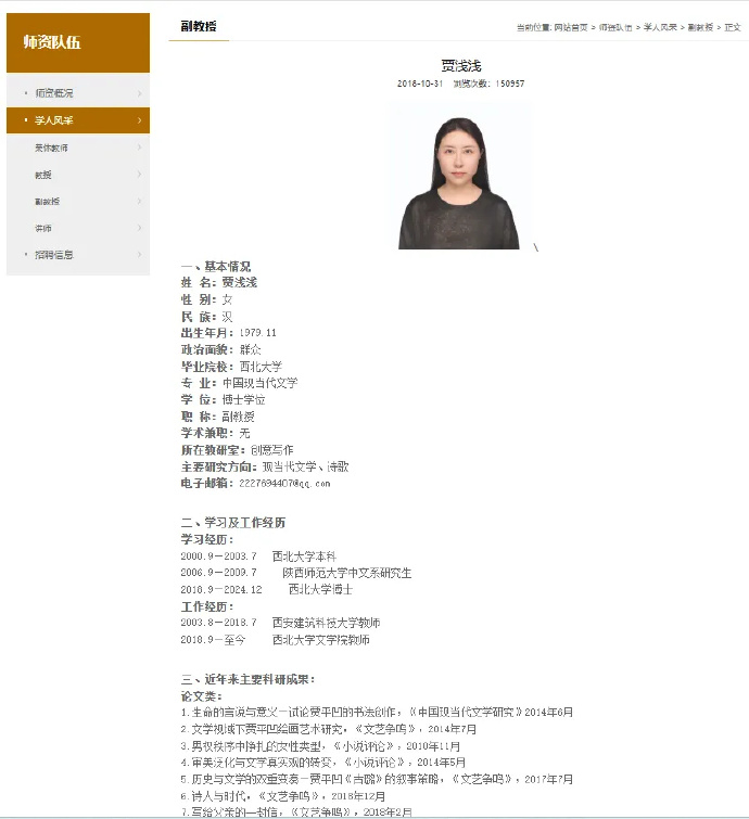 据西北大学文学院官网2018年10月消息,贾浅浅生于1979年11月,为该校创意写作教研室副教授,主要研究方向是中国现当代文学、诗歌。其本科就读于西北大学中文系,毕业后入职西安建筑科技大学,2018年9月就读西北大学中文系博士学位,同年入职该校文学院。
