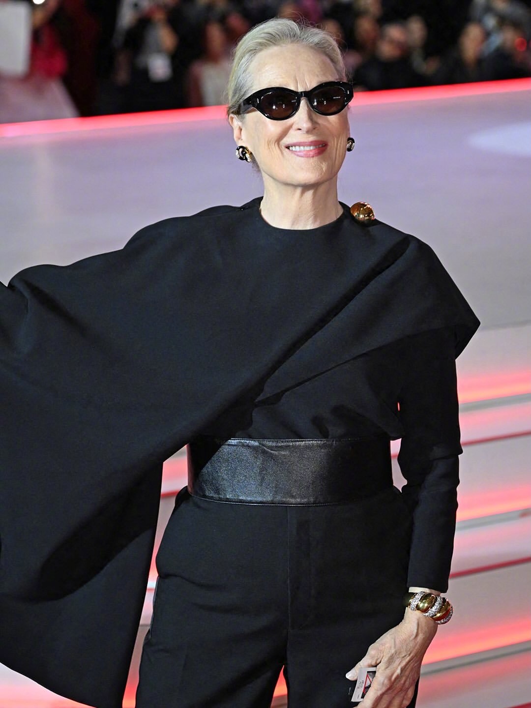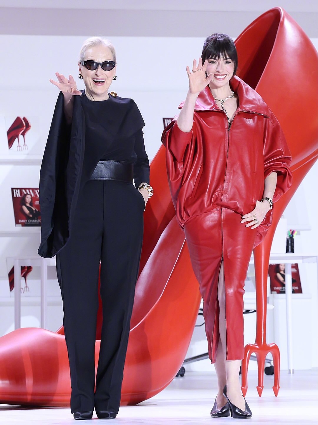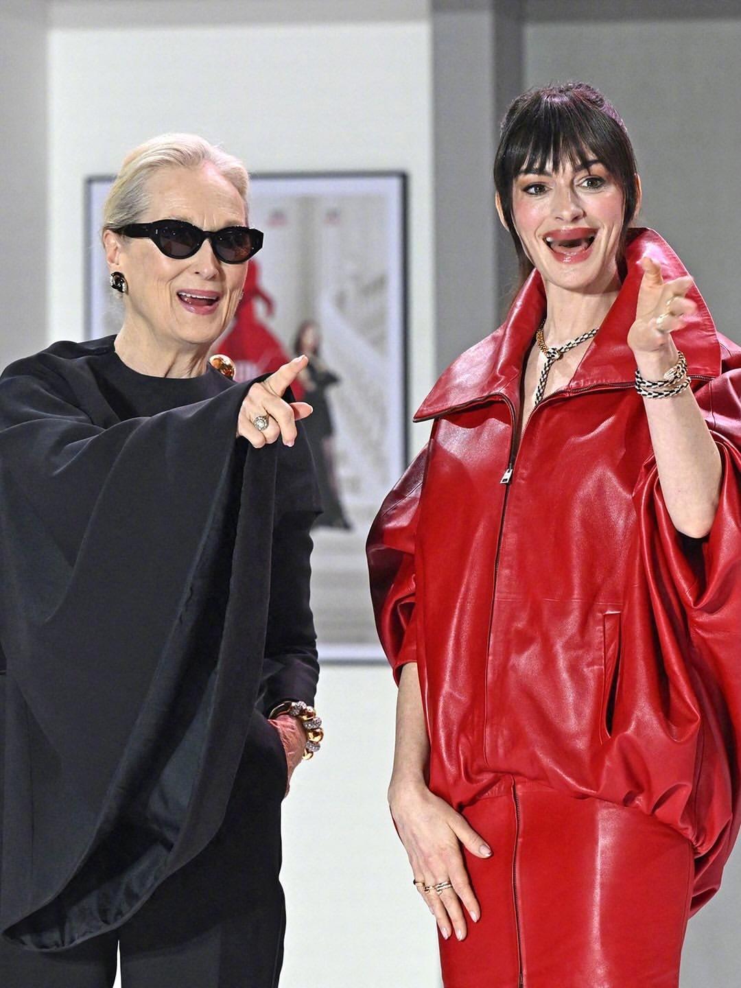 《穿普拉达的女王2》韩国红毯活动,两位主演梅丽尔·斯特里普和安妮.海瑟薇一黑一红造型亮相。梅姨身穿Celine 2026秋冬系列的定制服装和鞋,佩戴oliverpeoples墨镜和leightonjewels 耳环和手镯。安妮·海瑟薇身穿Balenciaga 2026 冬季系列红色皮衣和皮裙,佩戴宝格丽珠宝。米拉服饰解析