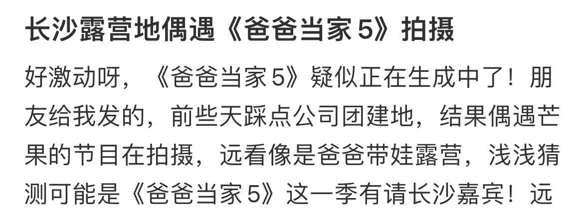 爸爸当家5长沙路透《爸爸当家5》在长沙开录啦!魏晨回归,韩庚疑似新加盟,两位初代唱跳偶像居然在育儿节目合体。还有网友露营时偶遇拍摄,这季可能加了长沙本地家庭,期待播出!爸爸当家