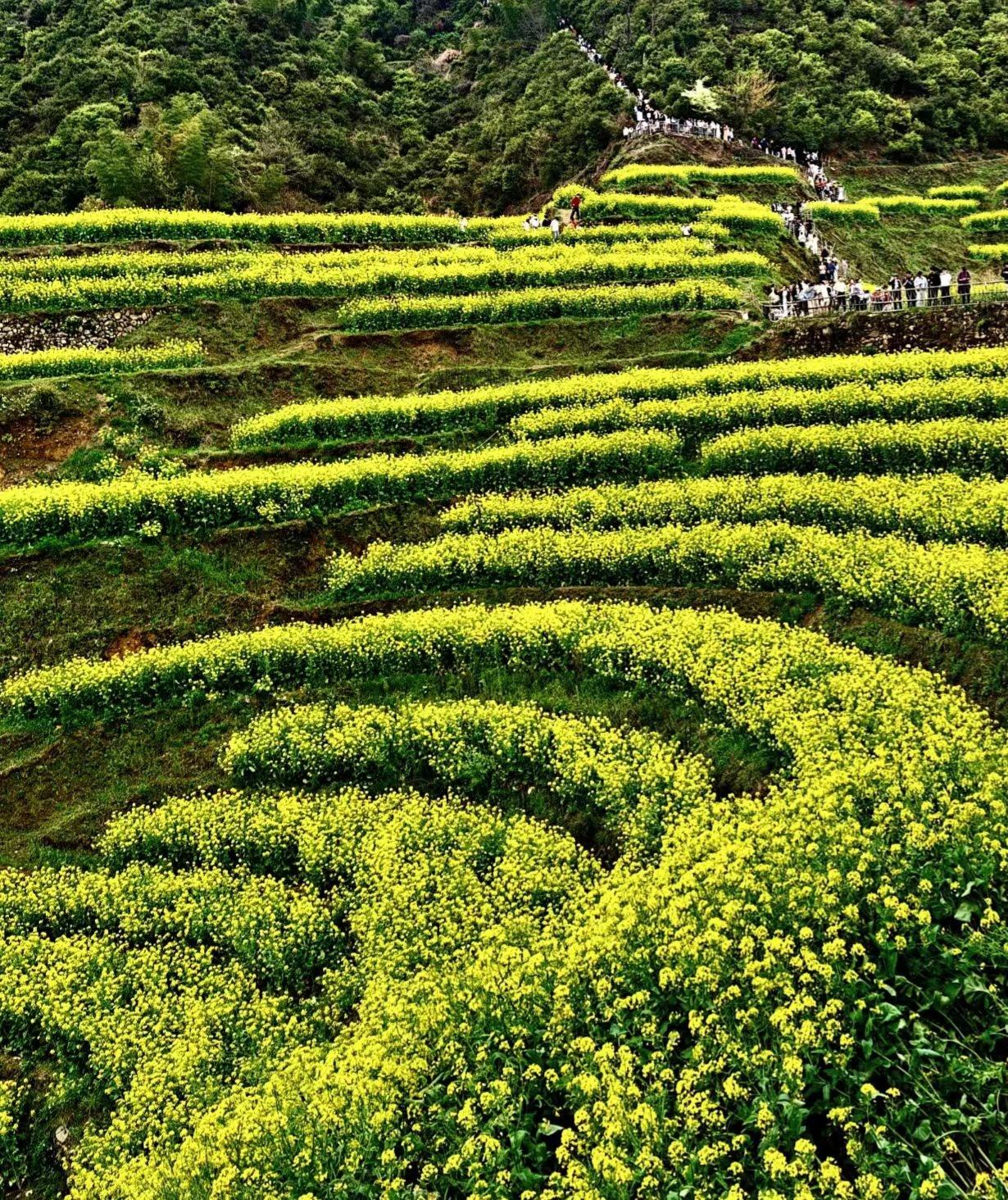 2. 赴一场春日花海之约,在篁岭的梯田间穿行。漫山金黄铺展在山野间,游人穿梭在花