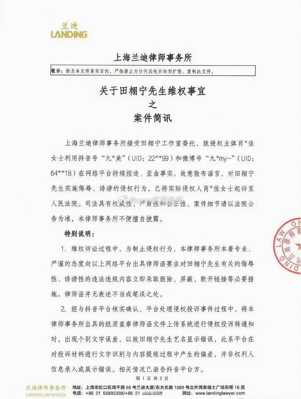 田栩宁告了九成美田栩宁名誉维权最新进展