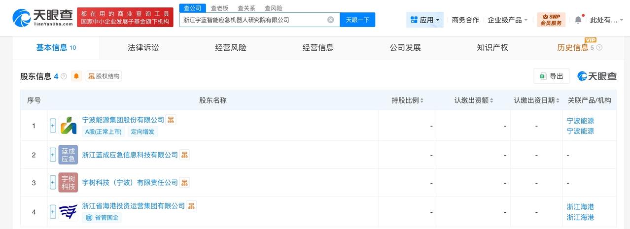 天眼查工商信息显示,近日,浙江宇蓝智能应急机器人研究院有限公司成立,法定代表人为李晓峰,注册资本1000万人民币,经营范围包括技术服务、技术开发、技术咨询、技术交流、技术转让、技术推广,智能机器人的研发,人工智能基础软件开发等。股东信息显示,该公司由宁波能源(600982)、浙江蓝成应急信息科技有限公司、宇树科技(宁波)有限责任公司、浙江省海港投资运营集团有限公司共同持股。