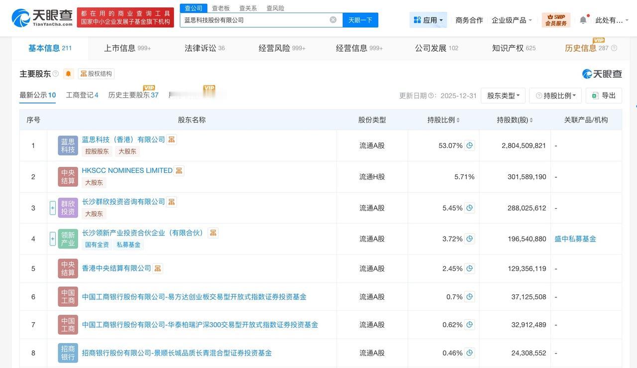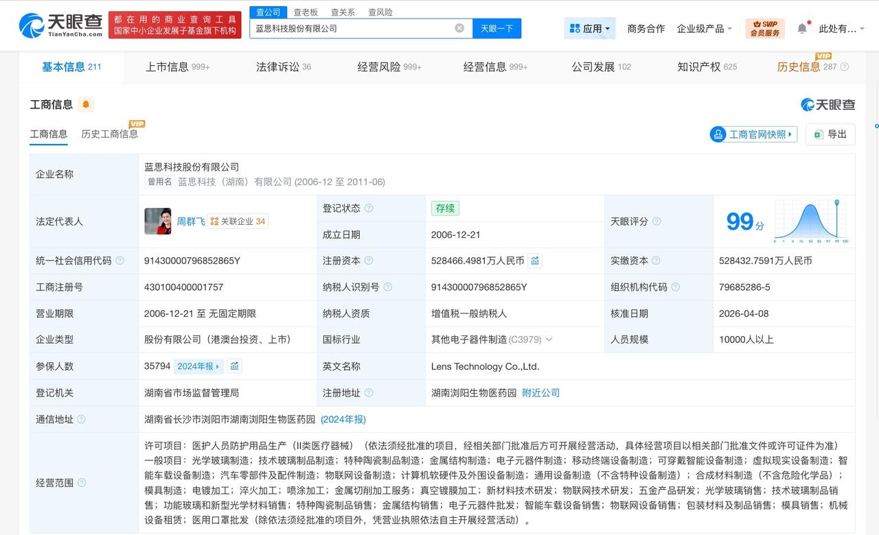 天眼查工商信息显示,近日,蓝思科技股份有限公司发生工商变更,注册资本由约49.8亿人民币增至约52.8亿人民币,增幅约6%。