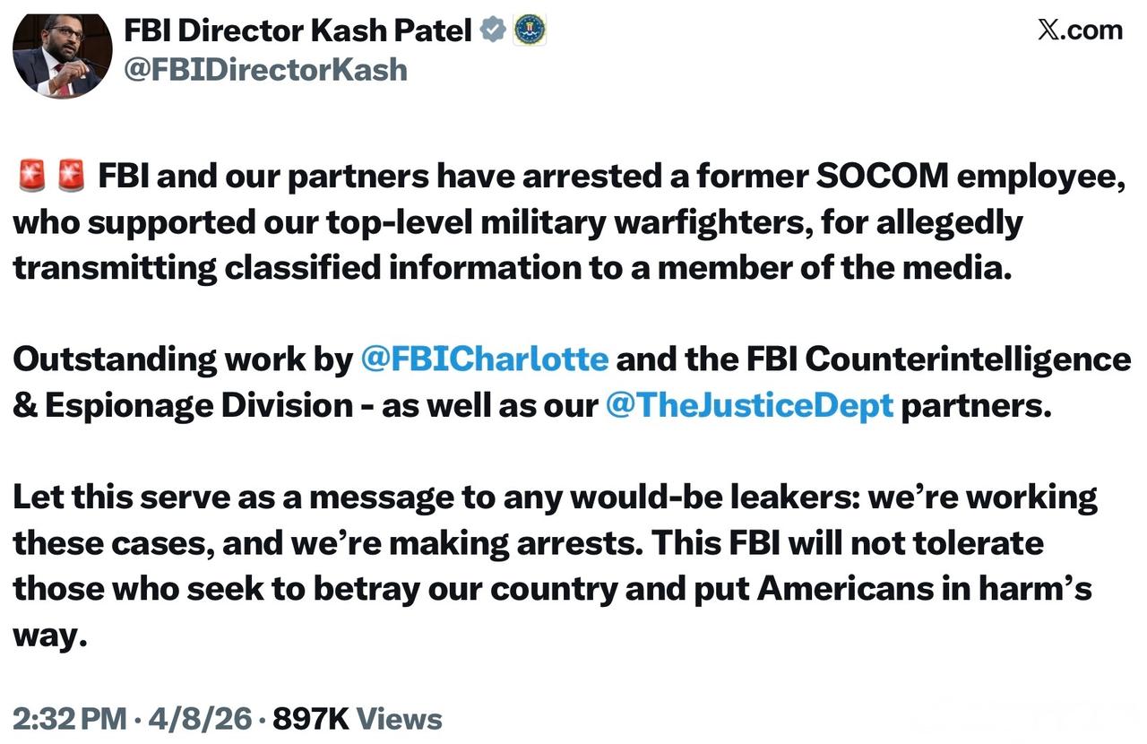 FBI 局长帕特尔宣布已逮捕了泄密者。伊朗政权起初并不知道还有幸存者,但她的泄密情报,等于给伊朗递了刀子,让在敌境的受伤飞行员、原本隐秘的救援行动、以及数百名正在寻找他的美军,处于极大的风险之中,差点害死在敌后的美军士兵。
