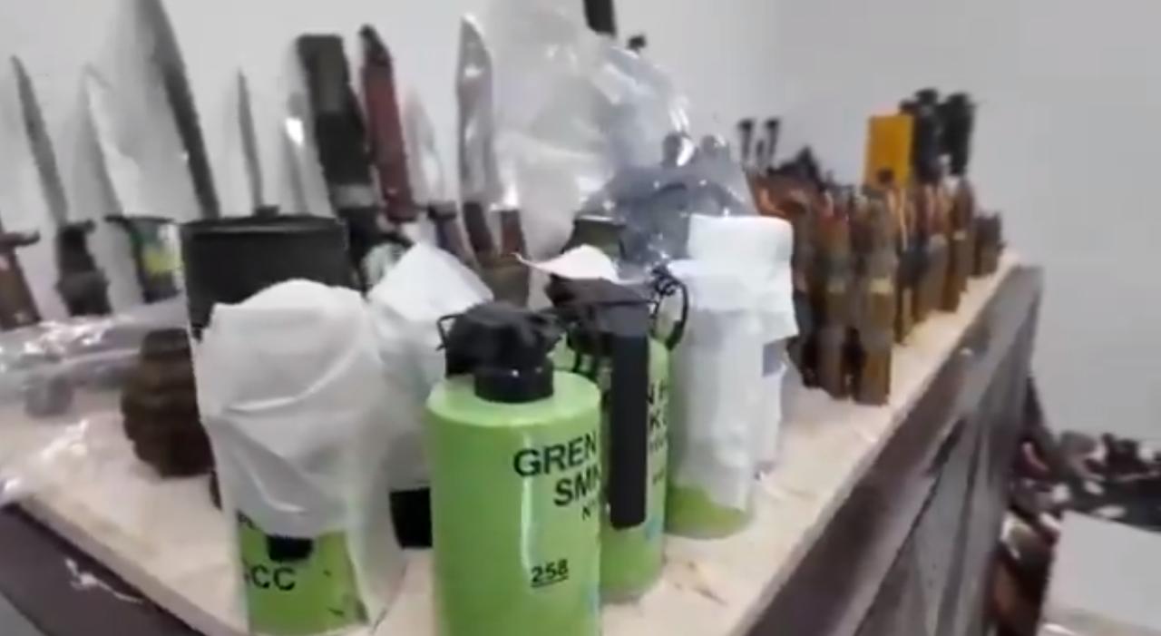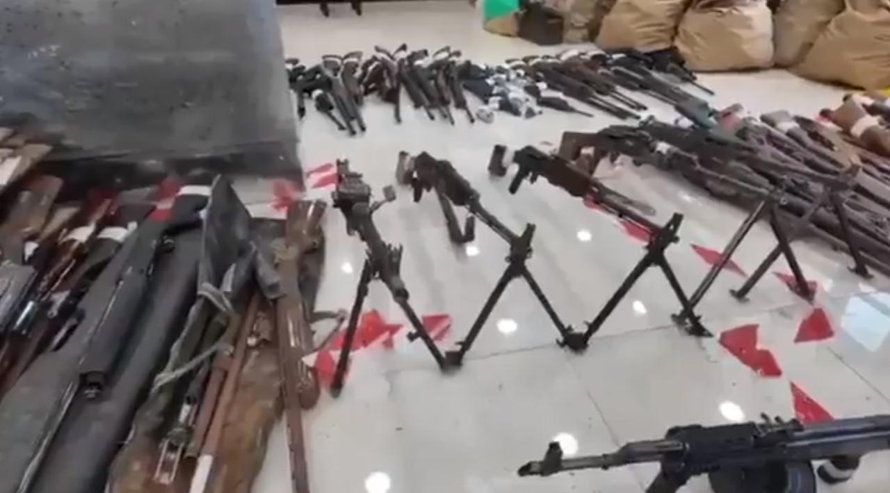 视频中,大量武器堆放在地板上,包括AK系列步枪、霰弹枪、成箱的子弹和手榴弹,最后是科威特警察的徽章。