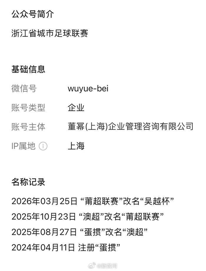4月9日,新黄河记者查看“吴越杯”账号发现,其注册主体为董幂(上海)企业管理咨询有限公司,其公众号的内容从4月1日开始,就发布了关于浙江省城市足球联赛的相关内容,包括门票预订、赛程、赛场剪影等信息。记者还发现,该公众号在2024年4月11日注册时,名字为“蛋掼”,于2025年8月改名为“澳超”,接着于当年10月改名为“莆超联赛”,最后在今年3月25日改名为“吴越杯”。其在公众号简介中标注自己为“浙江省城市足球联赛”。(记者郑旭)原文:网页链接