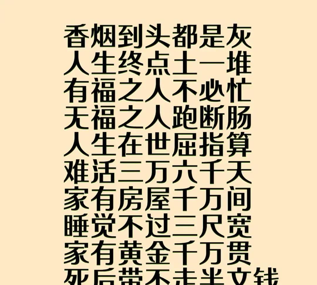 其实回头想想,啥不是一场空?香烟抽到最后只剩灰烬,人活到终点都归于尘土。有福的人不用瞎忙活,没福的人跑断腿也白搭。这辈子短短几十年,生不带来死不带去的东西,犯得着跟生活较劲吗?