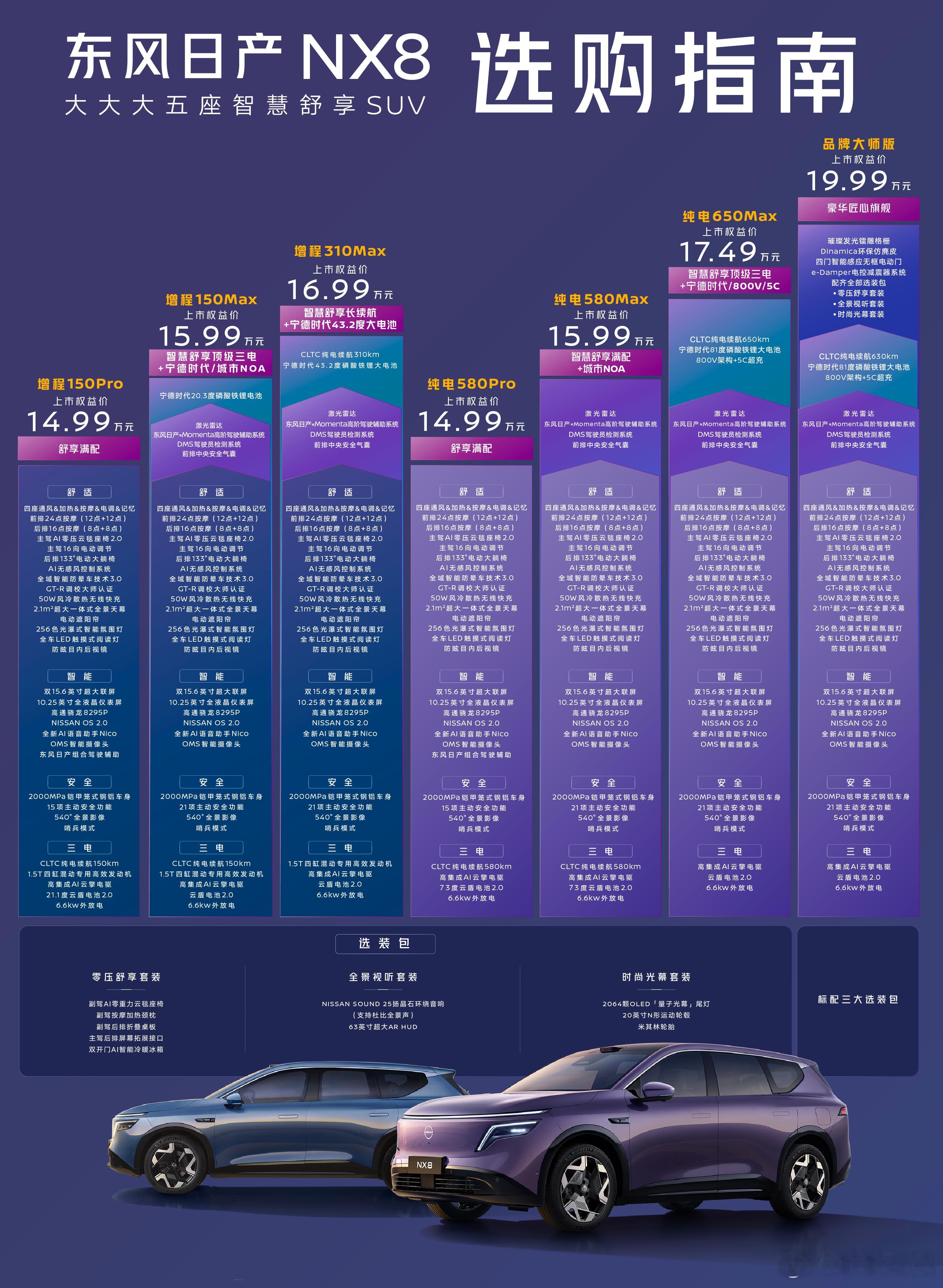 此外,东风日产还特别推出了NX8品牌大师版,搭载800V 5C超充,标配三个其它版本需要选装的套装,搭载带预瞄功能的e-Damper电控减震器系统,一步到位,限时权益价也仅19.99万。