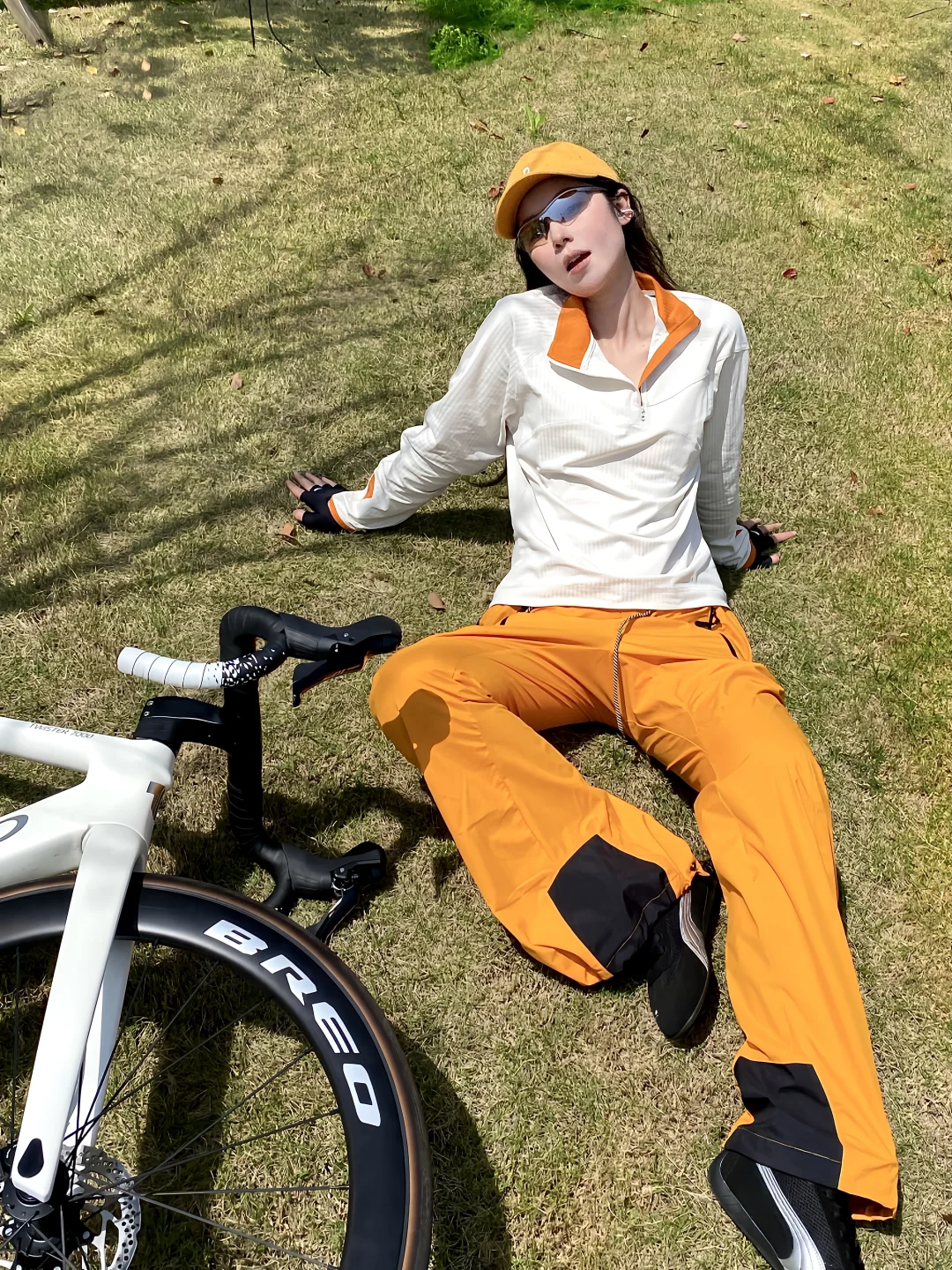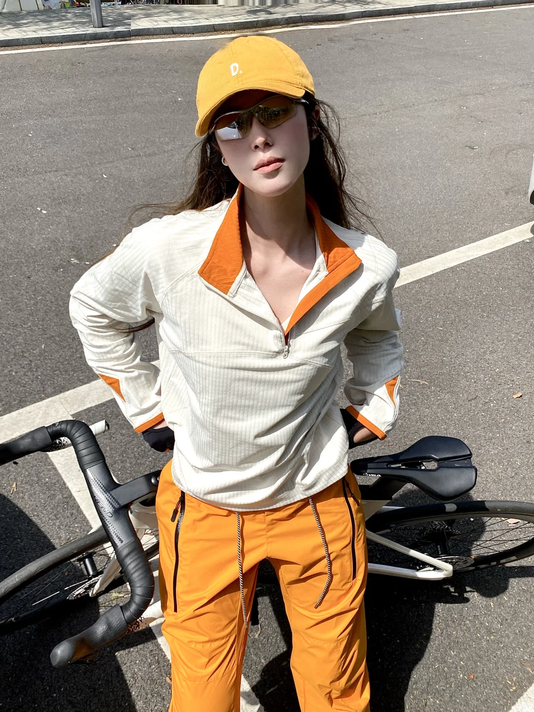配上同色系鸭舌帽+骑行墨镜