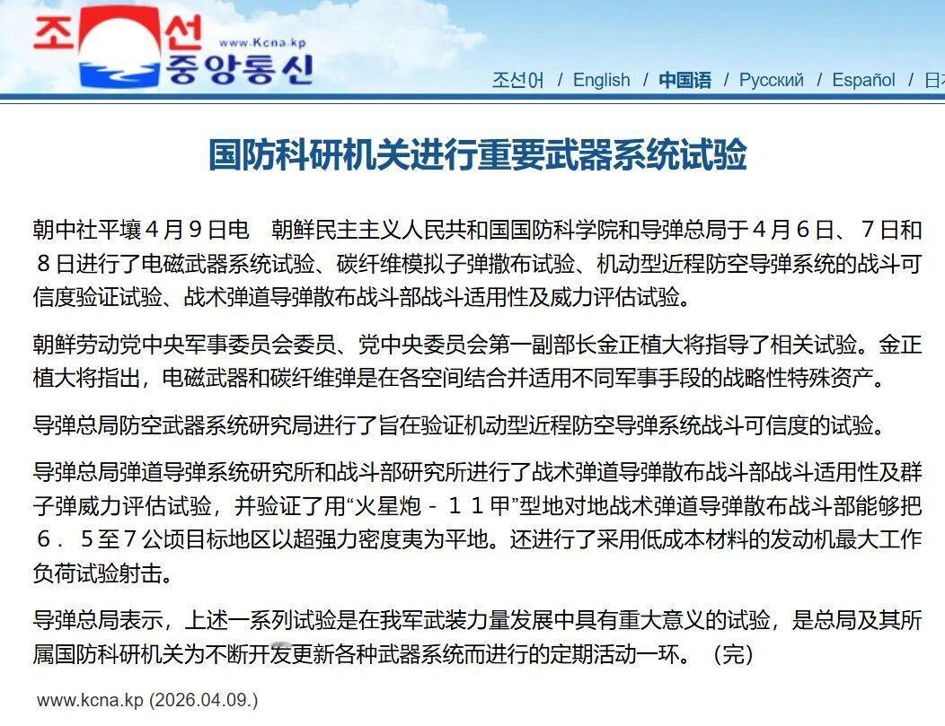 【朝鲜🇰🇵进行“军事 电磁武器系统试验、碳纤维模拟子弹撒布试验”】4月9日,朝中社以“国防科研机关进行重要武器系统试验”为题报道了朝鲜国防科学院和导弹总局在6-8日期间进行多款武器试验的情况