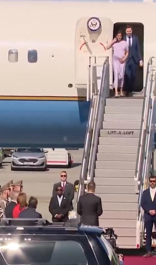 今天,怀孕的第二夫人乌莎·万斯与副总统约翰·迪·万斯抵达匈牙利布达佩斯,她轻抚着