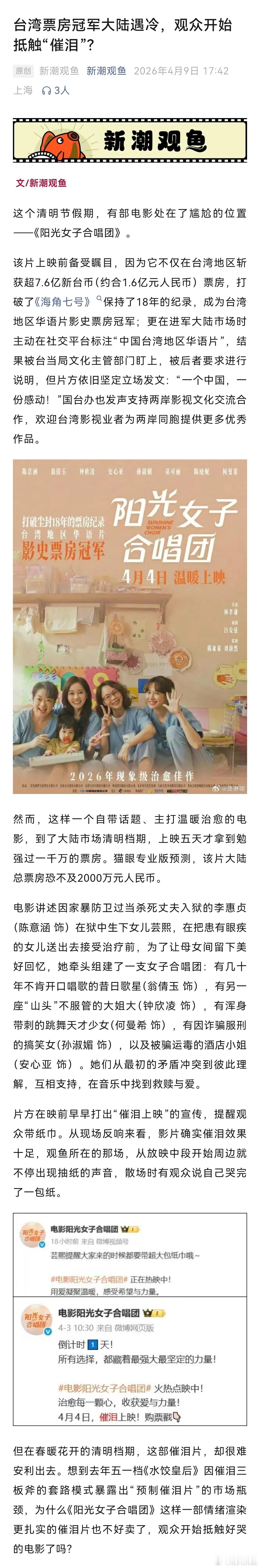 催泪电影为什么不好卖了【台湾票房冠军大陆遇冷,观众开始抵触“催泪”?】台湾地区华语片影史票房冠军、主动标注“中国台湾地区华语片”,自带话题、主打温暖治愈的电影《阳光女子合唱团》在映前就早早打出“催泪上映”的宣传,提醒观众带纸巾。