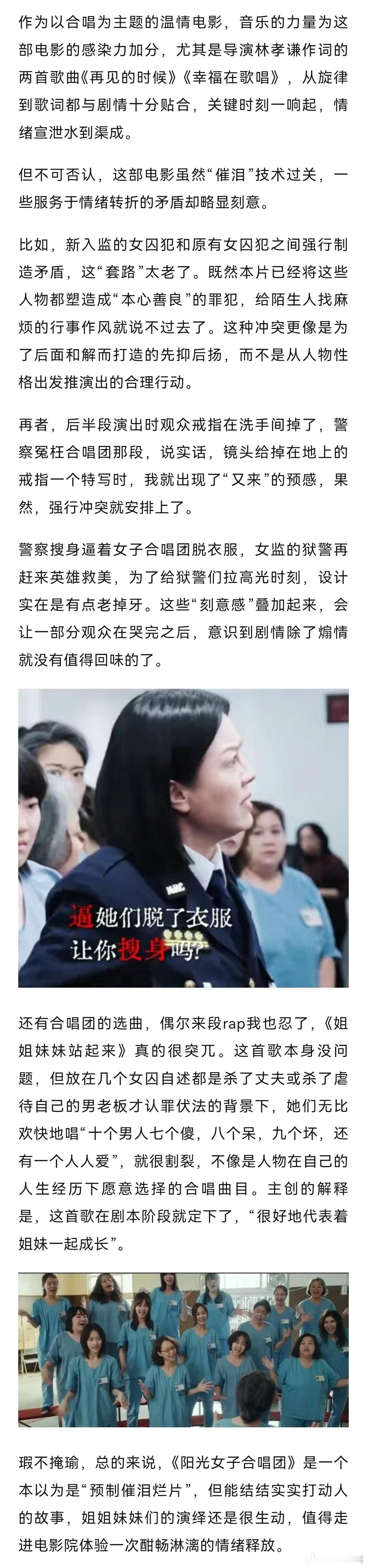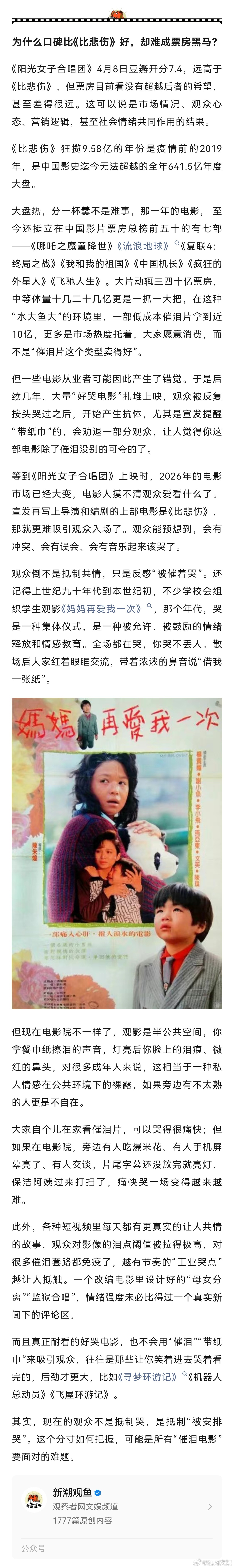 想到去年五一档《水饺皇后》因催泪三板斧的套路模式暴露出“预制催泪片”的市场瓶颈,为什么《阳光女子合唱团》这样一部情绪渲染更扎实的催泪片也不好卖了,观众开始抵触好哭的电影了吗?