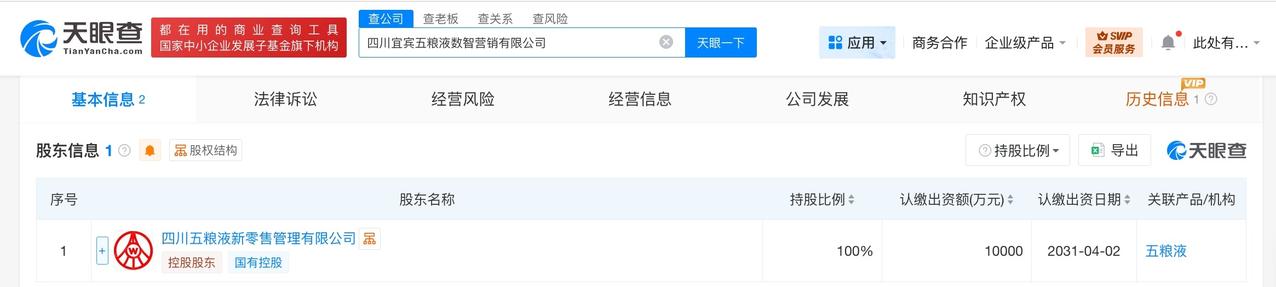 天眼查工商信息显示,近日,四川宜宾五粮液数智营销有限公司成立,法定代表人为廖泽洪,注册资本1亿人民币,经营范围包括酒类经营、食品销售、软件开发等。股东信息显示,该公司由四川五粮液新零售管理有限公司全资持股。