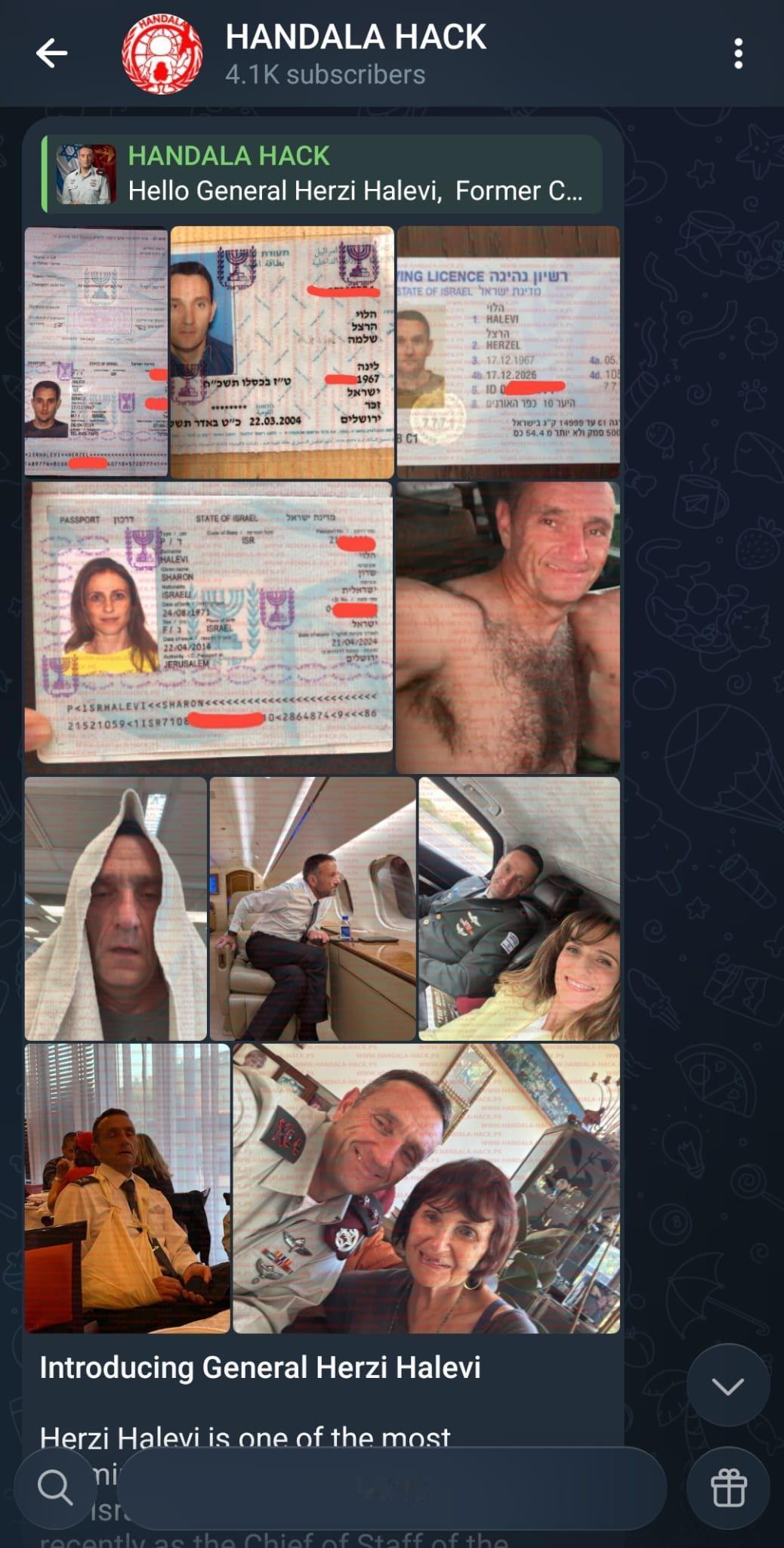 第三张照片是“汉达拉黑客组织”在Telegram上发布的一张拼贴图,展示了哈勒维的个人身份证件、护照、家庭照片以及一张赤膊自拍照,这只是更大规模数据泄露的一部分。