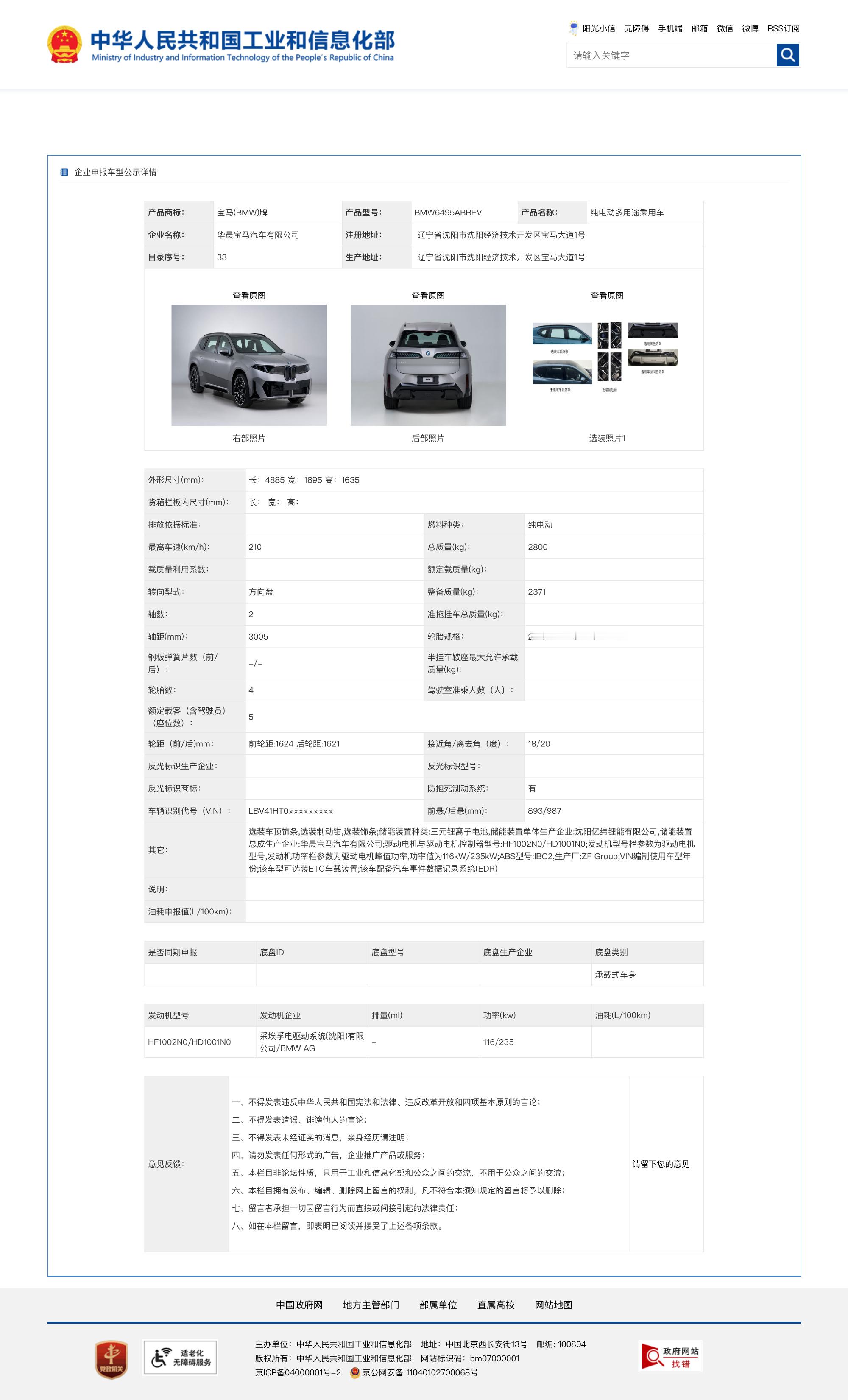 国产宝马新世代iX3长轴距版申报图,标志着宝马新世代首款量产车型进入中国市场落地
