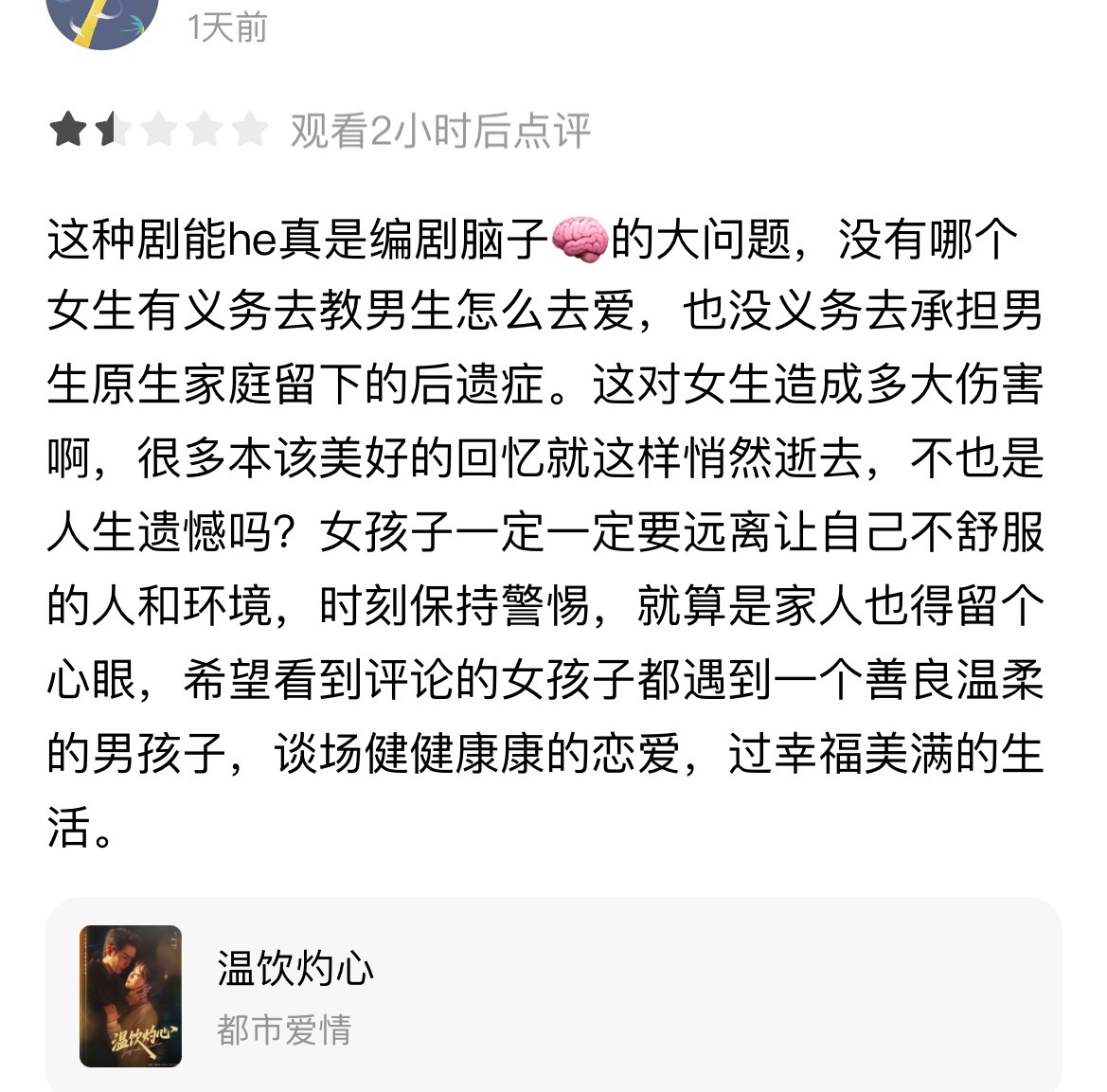 点开红果,被随机推给我的一部短剧的评论区吸引了。红果的受众真的也没那么下沉嘛。蛮喜欢这段话的,所有编剧都来看看——没有哪个女生有义务教男生怎么去爱,也没有义务去承担男生原生家庭留下的后遗症。女孩子要远离让自己不舒服的人和环境,哪怕是家人。