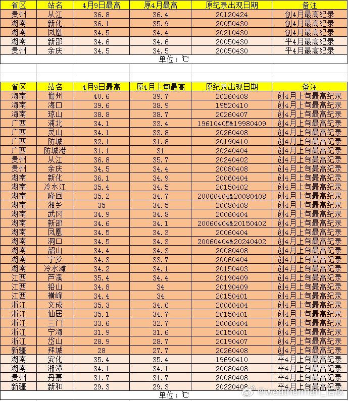 【高温破纪录】今天海南、广西、贵州、湖南、江西、浙江、新疆共29个站点气温打破当地4月上旬最高纪录,比如儋州40.6℃、海口39.6℃。其中还有3站打破当地4月最高气温纪录:贵州从江36.8℃、湖南新化36.1℃、凤凰34.5℃。
