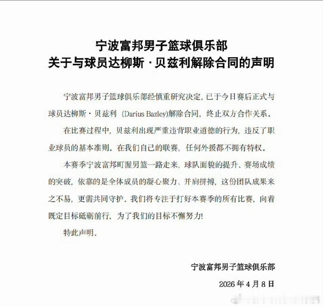 在CBA常规赛的一场焦点战后,宁波富邦男篮俱乐部做出了一个震惊篮坛的决定。在与辽宁本钢队的比赛结束后,宁波男篮官方迅速发布声明,宣布正式与外援达勒斯·贝兹利解除合同。这一“当场解约”的铁腕手段,不仅彰显了俱乐部整顿队纪的决心,更将职业球员的道德准则推向了舆论的风口浪尖。