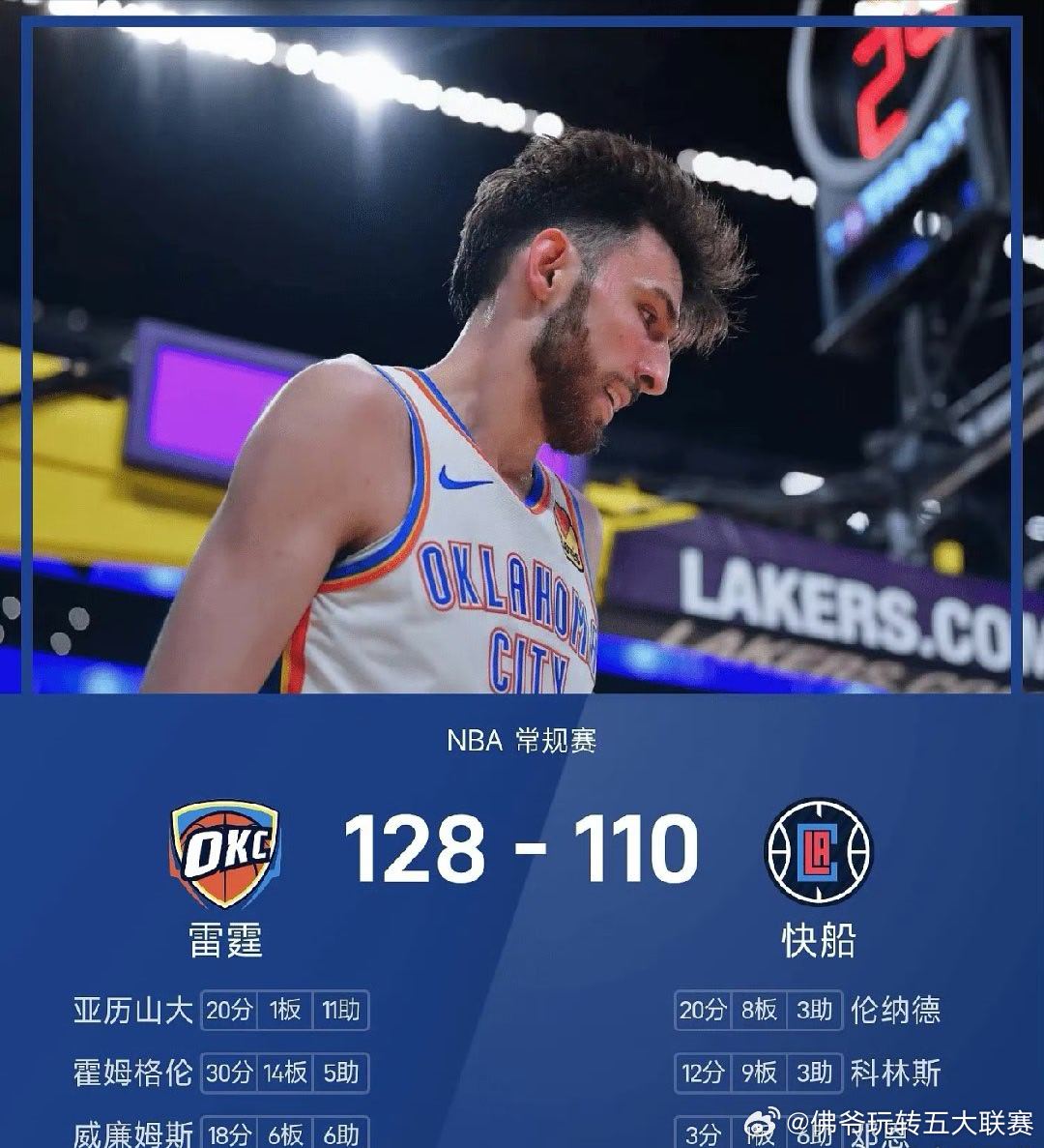 雷霆大胜快船18分锁定西部第一!霍姆格伦30+14统治内线,亚历山大11助攻盘活