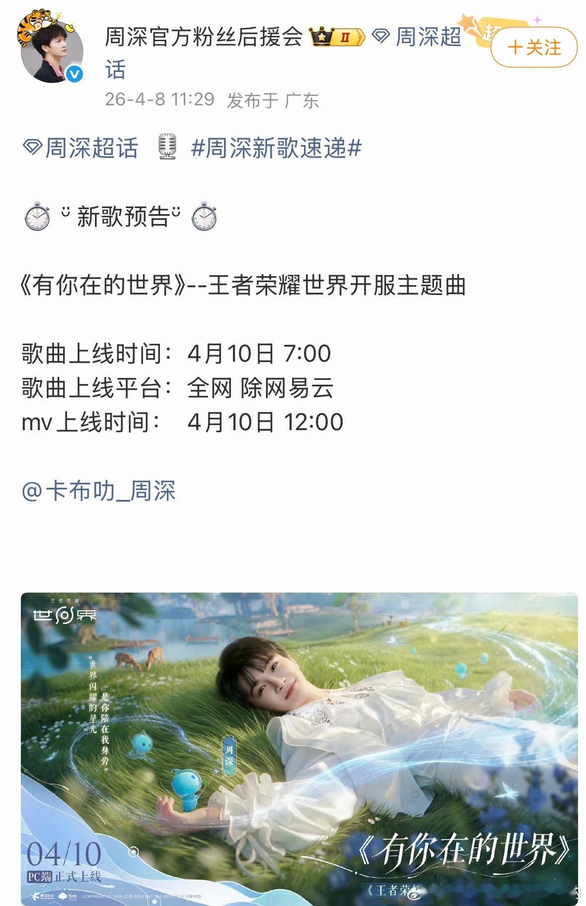 周深新歌王者荣耀世界开服主题曲《有你在的世界》4月10日全平台上线,全网除网易云