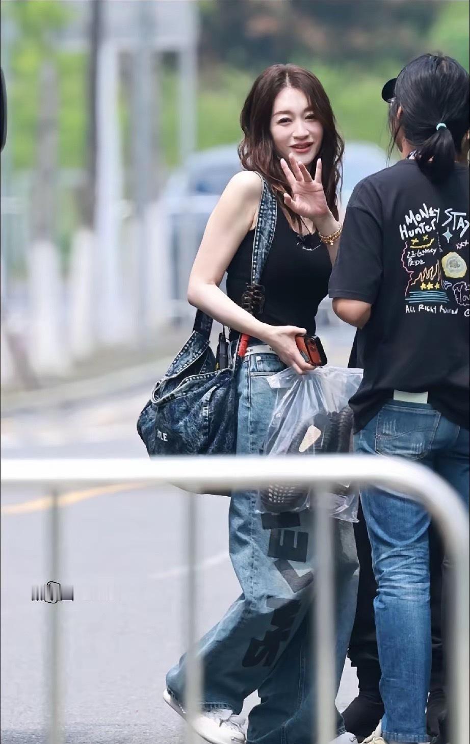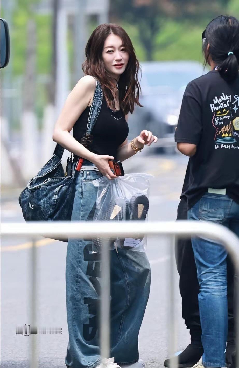 刷到今日上班的李小冉,即将50岁的她简直逆生长,黑色吊带背心+牛仔裤、牛仔包,标