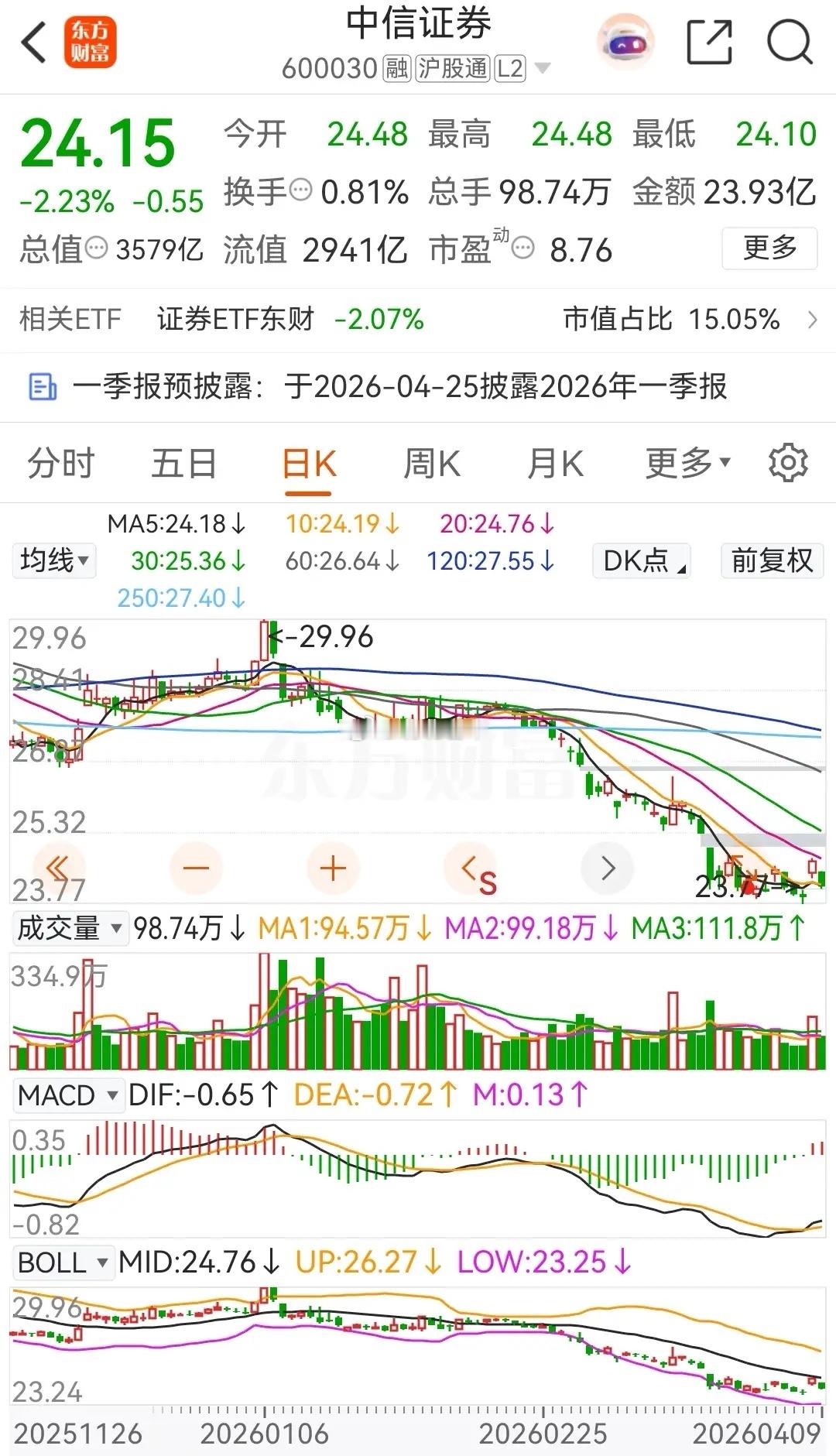 东方财富和中信证券今天低开低走,分别下跌了2.77%和2.23% ,在2026年