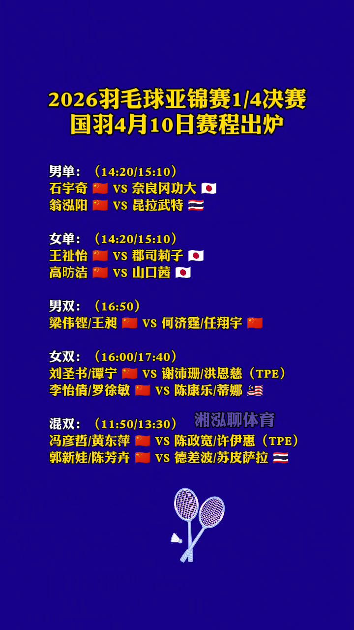 2026羽毛球亚锦赛1/4决赛国羽4月10日赛程出炉。
