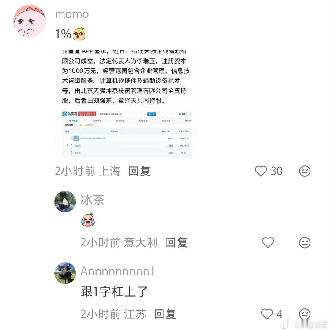 刘强东和章泽天新公司叫天强网友评论:刘强东名字用的只剩刘字还没配对过了;这名字像