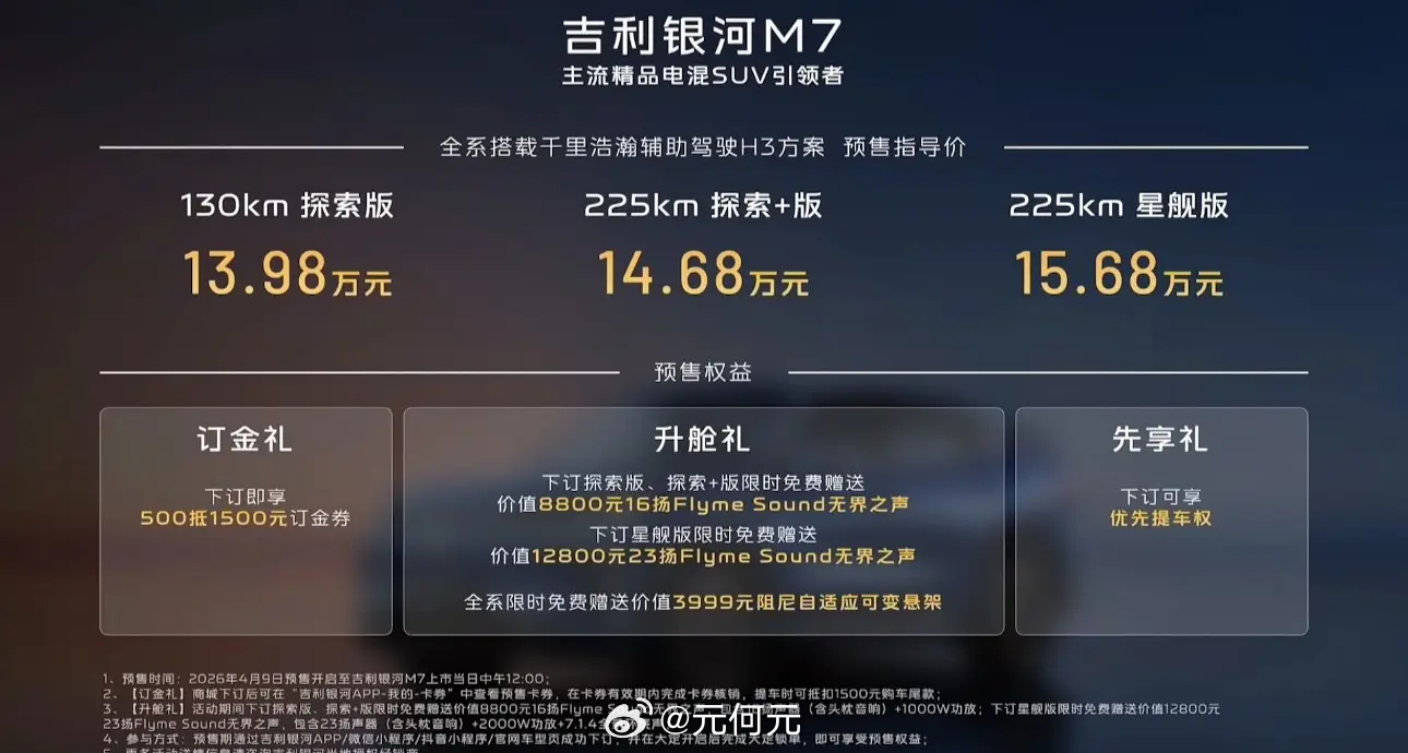吉利银河 M7 开启预售,价格 13.98 - 15.68 万元,推出三重豪礼。该车宛如主流插混市场深水炸弹,以高续航、高性能和全系标配智能座舱,在 10 - 15 万红海市场实现技术降维打击。神盾金砖电池搭配雷神超级电混,续航长、补能快、耐久性强且油耗低。全系标配 Flyme Auto 2 智能座舱与千里浩瀚 H3 智驾方案,实现智能驾驶普及。81km/h 麋鹿成绩与出色制动距离,打破 SUV 操控短板,空间表现也领先同级。