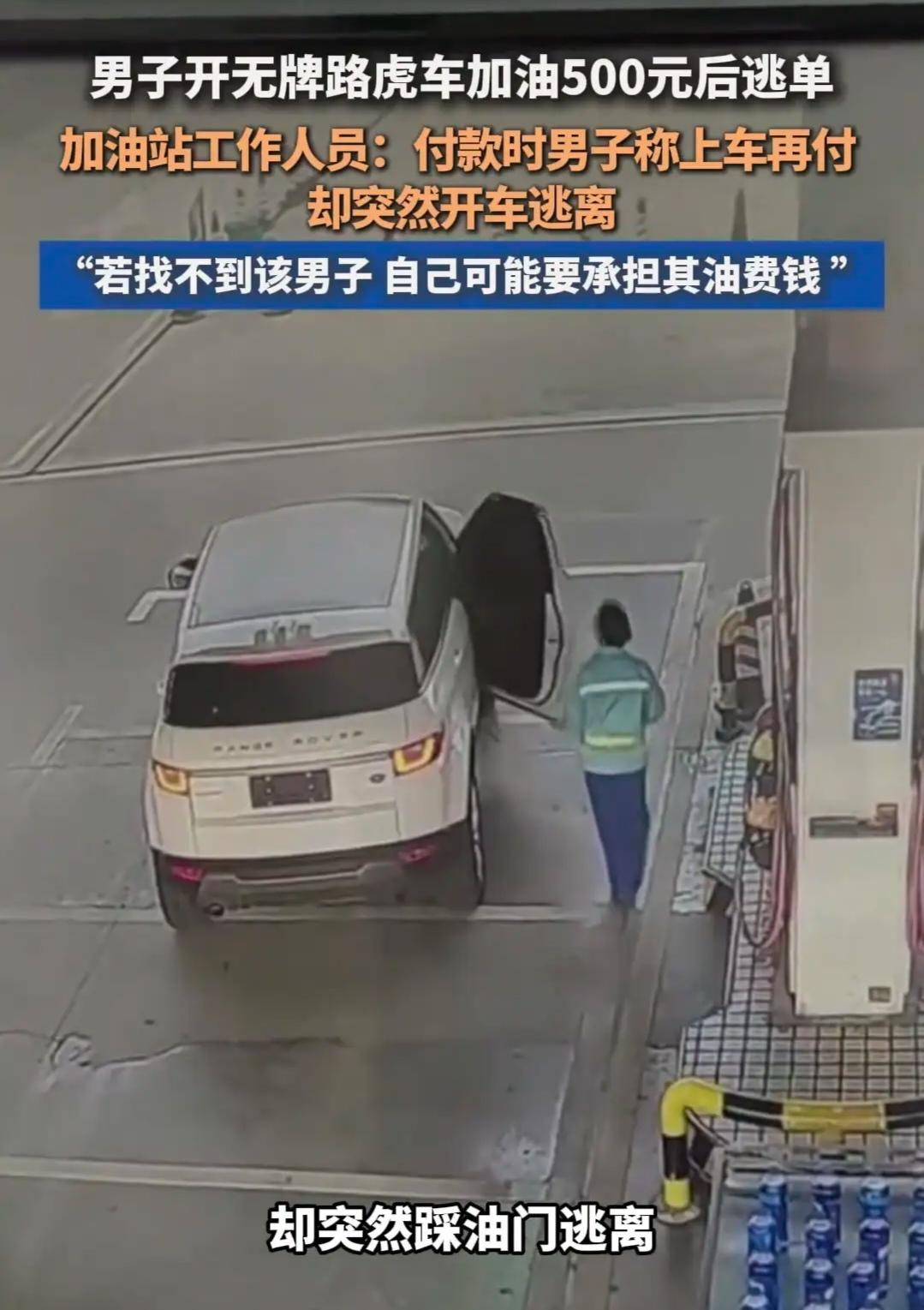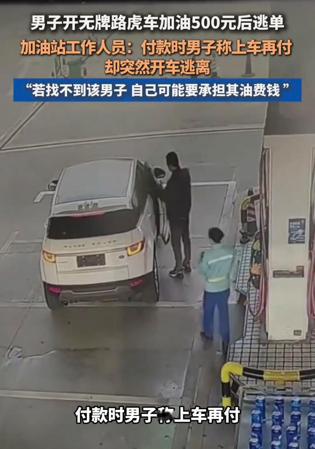 其实新闻报道也是有误,这个男子不是开着路虎来加油的,他是副驾驶坐着来的,真正的司机一直在驾驶位上没有下来,只能着加满油,同伙上车就跑路,根本就没有打算要付钱。