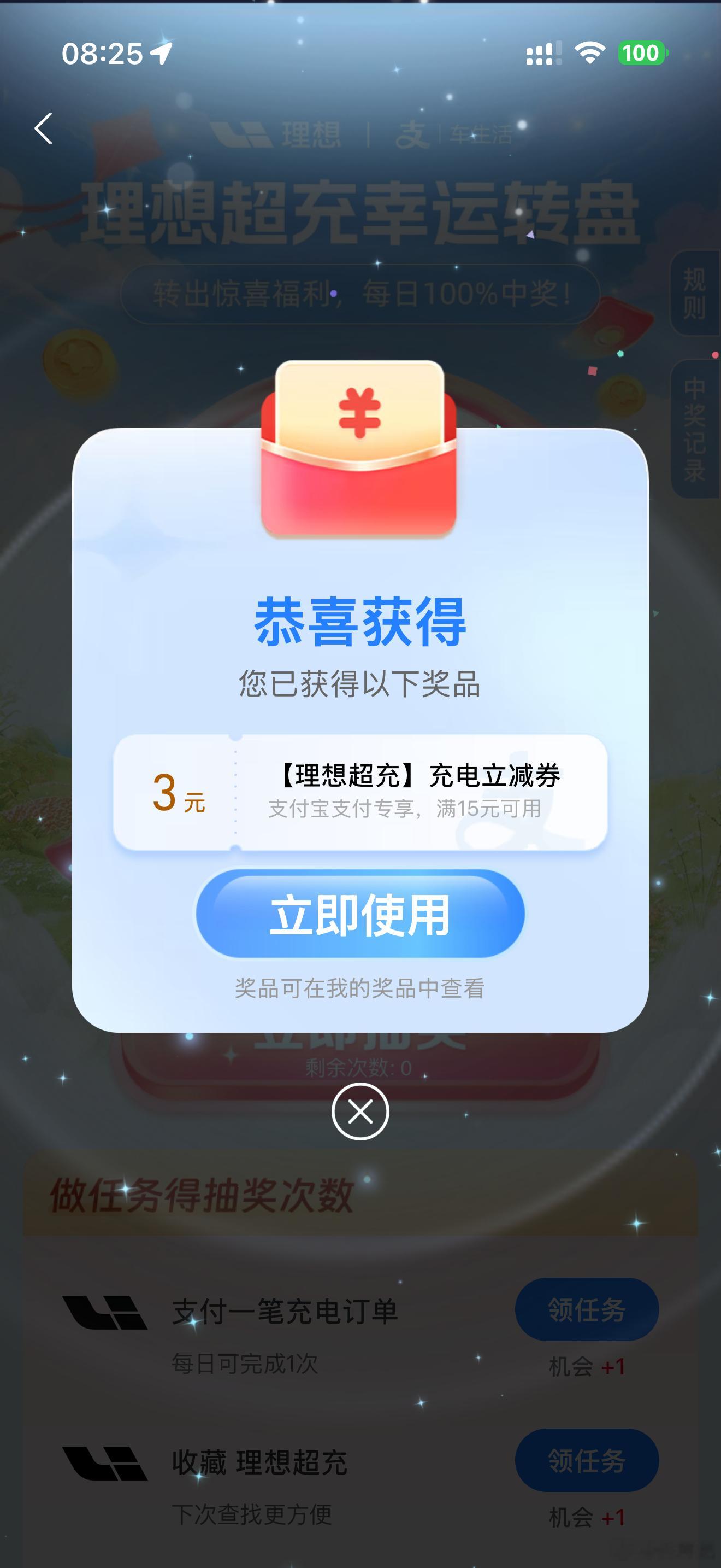 支付宝搜索「理想超充」→「点击参与」 →「立刻抽奖」