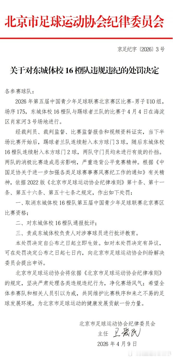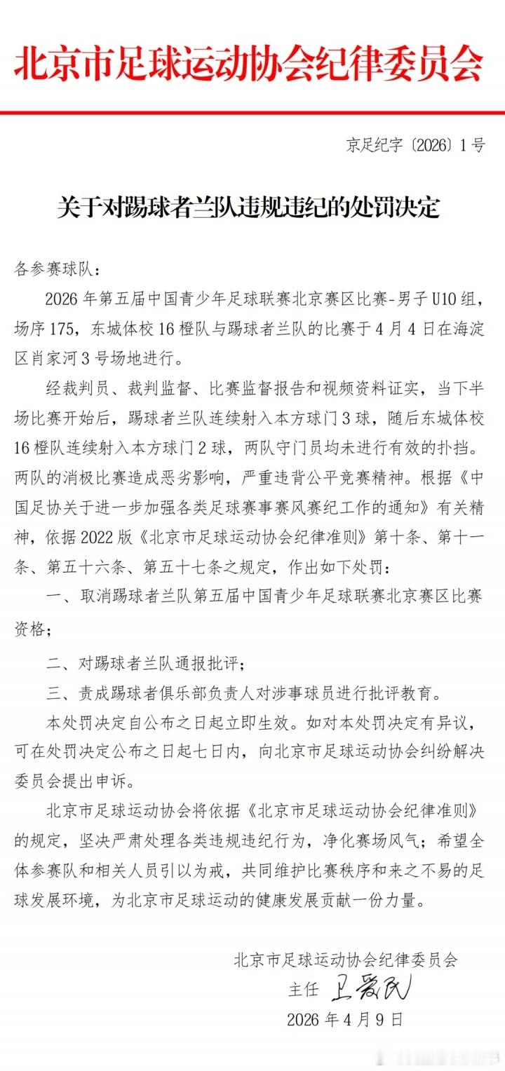 官方公告表示,在东城体校16橙队vs踢球者兰队的比赛中,下半场比赛踢球者兰队连续射入本方球门3球,东城体校16橙队连续射入本方球门2球。比赛出现明显消极行为并造成恶劣影响。