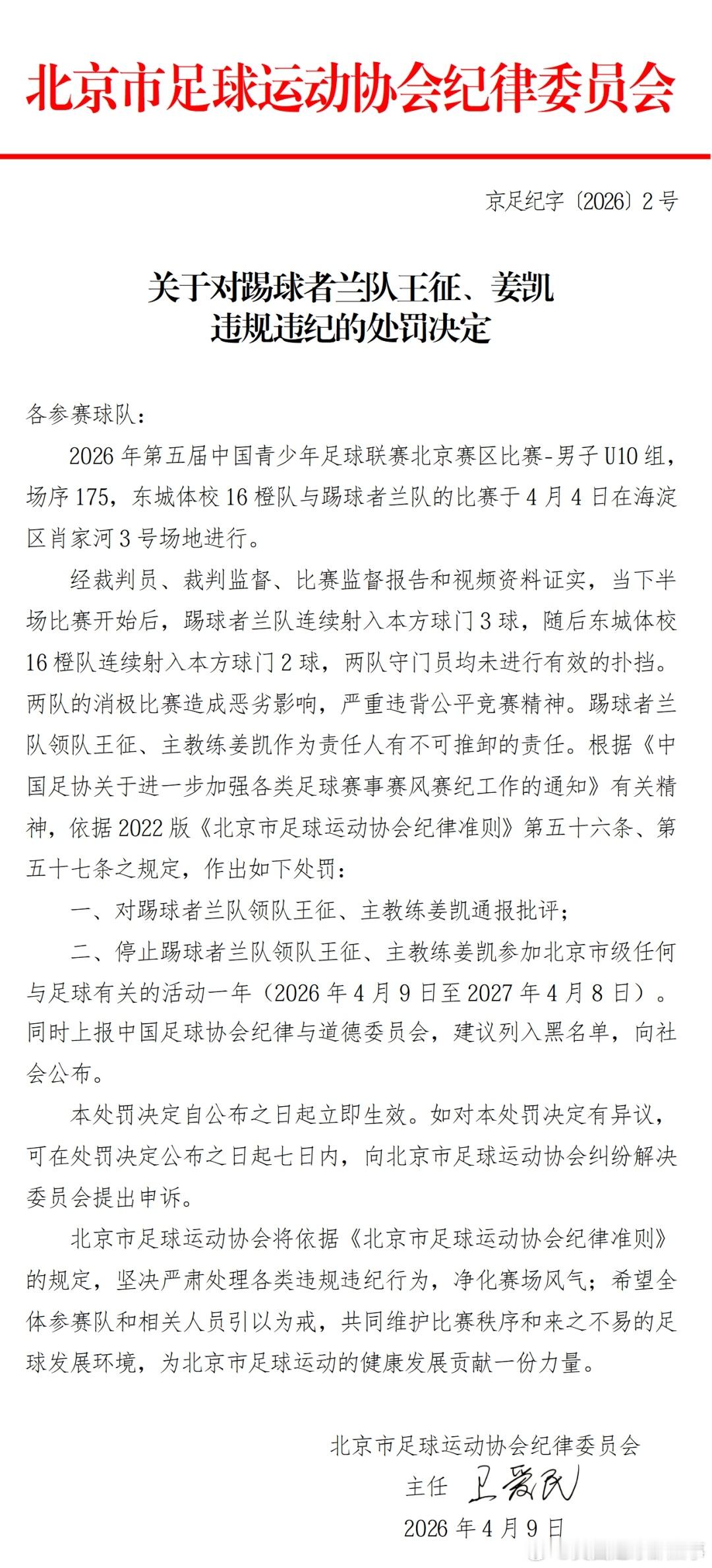 10岁就踢假球?北京足协通报:中青赛两队互射自家球门,取消比赛资格官方公告表示,