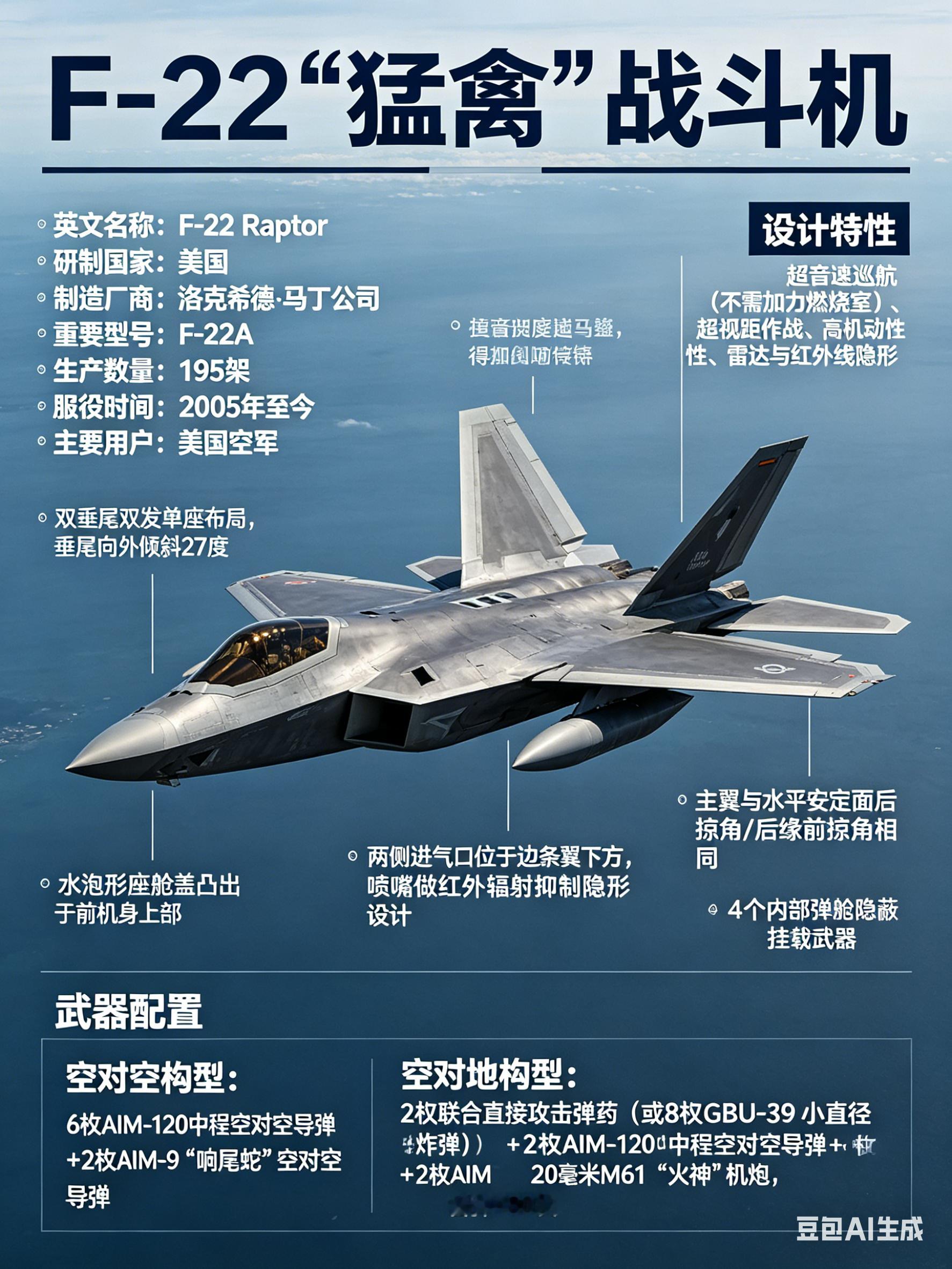 军事ai新视野 F-22“猛禽”攻击机英文名称:F-22 Raptor研制国家: