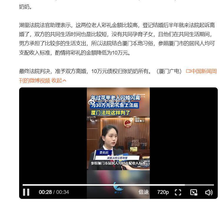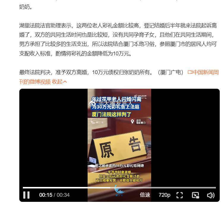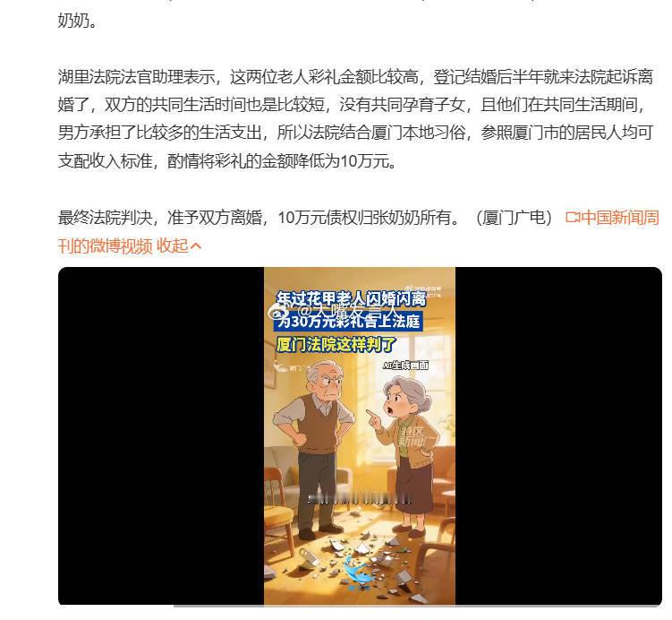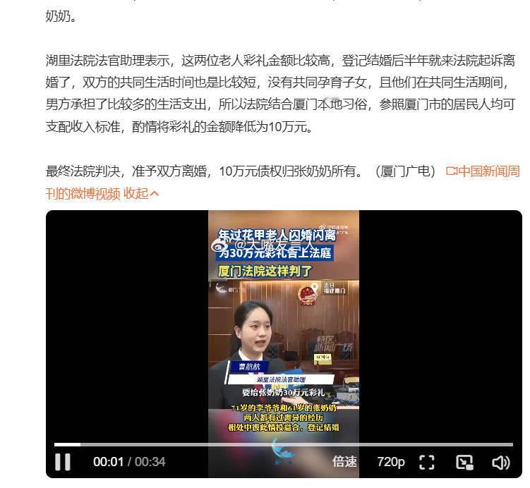 61岁老太闪婚闪离30万彩礼判获10万 结婚半年离婚,30万元彩礼只退回20