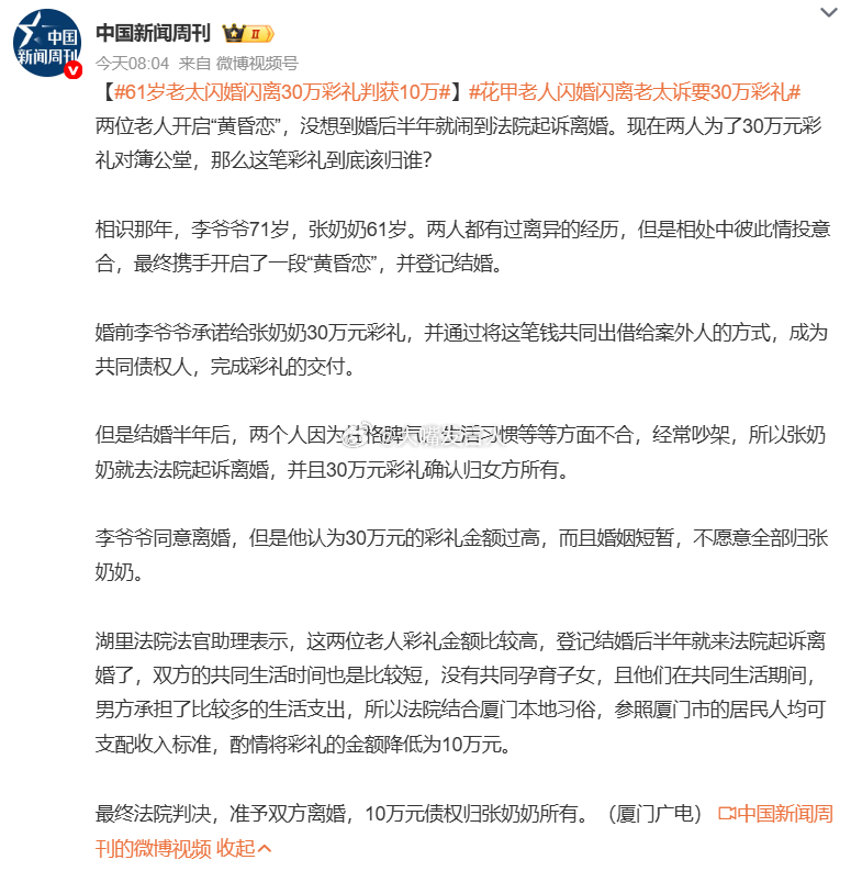 61岁老太闪婚闪离30万彩礼判获10万 结婚半年离婚,30万元彩礼只退回20万,10万元归61岁张奶奶半年10万元?这费用叫什么?肯定不能叫青春损失费,61岁的老太不算青春,也不能叫生育费,因为也没生育,,,,叫什么,大概可以算成陪睡费、暧床费,才比较合理吧等等,这个陪睡、暧床,是双向的呀,李爷爷也陪睡、暧床了,难道李爷爷的陪睡不值钱吗?花甲老人闪婚闪离老太诉要30万彩礼,热点观点