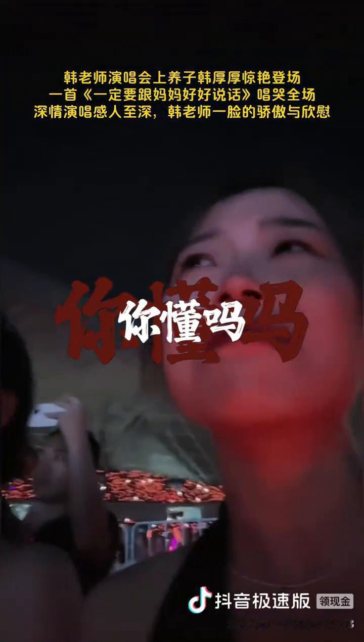 韩老师演唱会上养子韩厚厚惊艳登场,一首《一定要跟妈妈好好说话》唱哭全场,深情演唱感人至深,韩老师一脸的骄傲与欣慰。