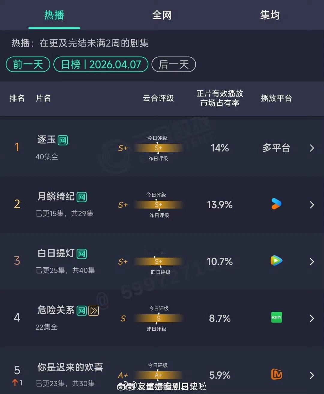 4.7云合集均播放量统计 张凌赫、田曦薇的逐玉 已经连续一个多月第一了,非常顽强(已经7100+w,大爆剧的均集了,但貌似没人拿它当回事 )鞠婧祎、曾舜晞、陈都灵、田嘉瑞的月鳞绮纪 13.9,还差0.1准备登顶