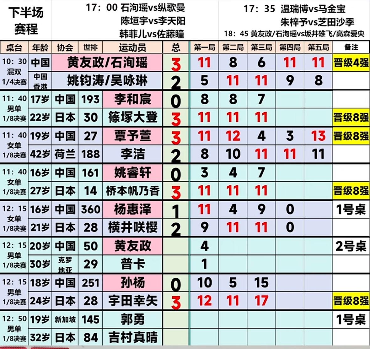 小将李和宸,孙杨都输给了日乒主力,没有惊喜,但小将拼的很顽强!