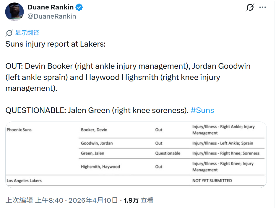 已经确定西部第七的太阳今天早些时候更新伤病报告,明天对阵湖人,缺阵的球员包括布克,古德温与海史密斯,杰伦·格林膝盖有伤出战成疑。