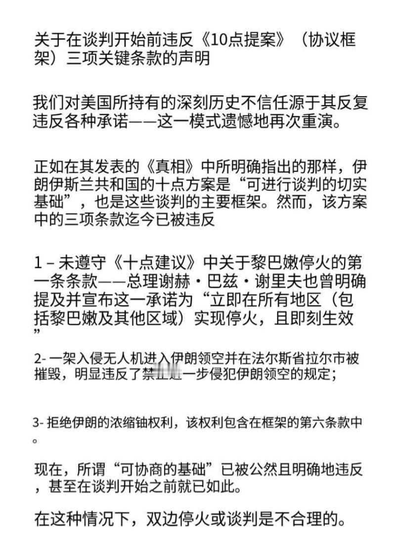 十点提案原本是伊朗提出的谈判框架,连美国总统特朗普都曾承认这是 可行的谈判基础,可谁也没想到,谈判还没正式摆上桌面,以色列就带头把协议撕得稀碎。