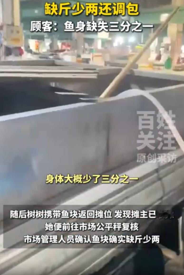 不仅如此,混在里面的几块肉,纹理完全不一样,明显是从别的鱼身上凑来的边角料。刘女士当场炸了。她拎着这盘"残肢断臂"杀回市场,摊位已经空了,人早跑了。她直奔市场管理处。管理人员拿出公平秤一称,实际重量比买的时候少了一斤多。