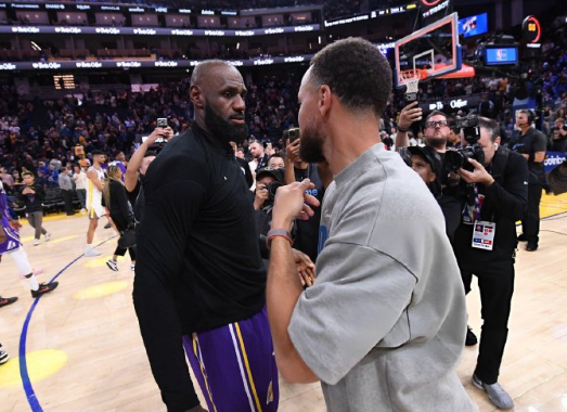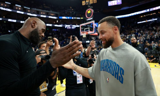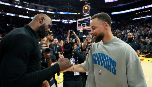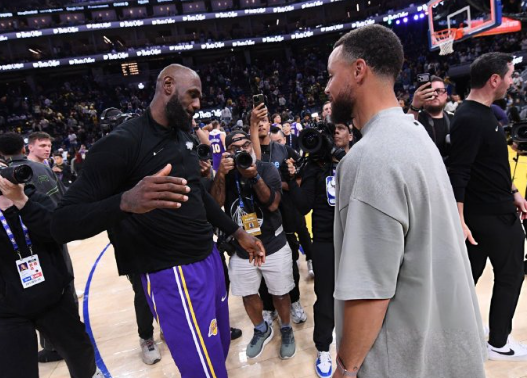 赢球当然得拥抱!詹姆斯赛后与穿着老詹战靴的库里拥抱交谈,随后库里还与布朗尼拥抱