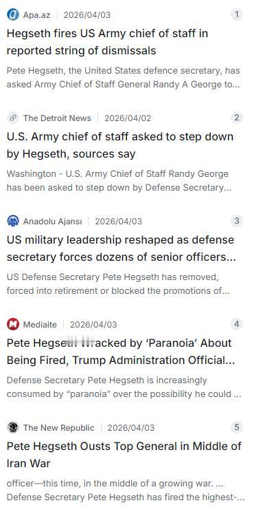 到了2026年4月,赫格塞思大概是觉得自己位子不稳了,开始疯狂排除异己。一天之内,陆军参谋长兰迪·乔治、负责转型与训练的大卫·霍德尼,还有管牧师团的小威廉·格林,三个四星上将全被撸了。兰迪·乔治2023年才上任,按说能干到2027年,结果被赫格塞思一句话就给赶走了。说是要换“自己人”上来,可明眼人都看得出来,这就是怕别人背后捅他刀子,先把不听话的清掉。军方高层都被这操作吓懵了,觉得这简直太疯狂了,仗还打着呢,你先把高层给清洗了,谁还服你?