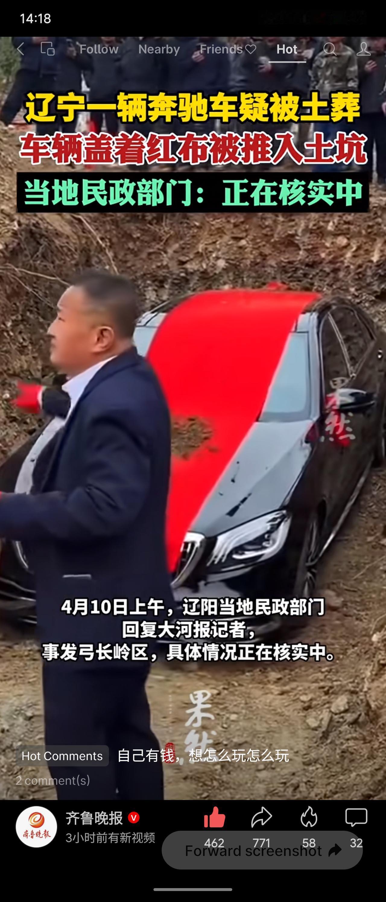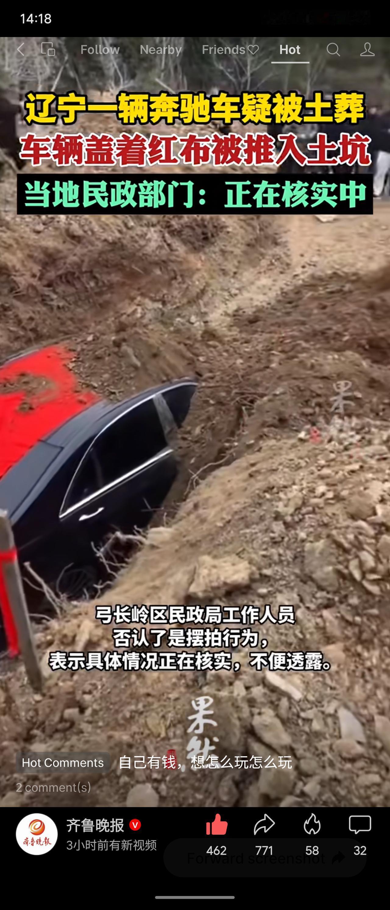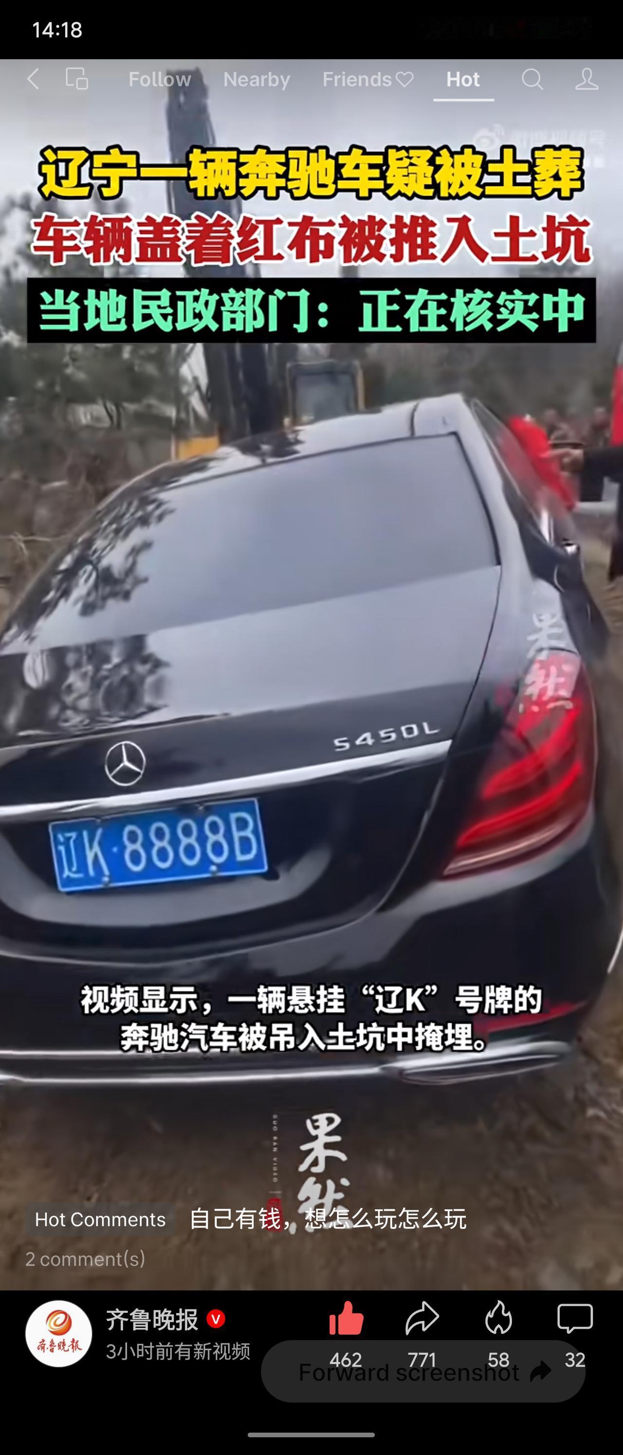 近日,辽宁辽阳弓长岭区出现一辆奔驰轿车被盖红布推入土坑掩埋的视频,引发热议。车牌为“辽K·8888B”。当地民政部门表示正在核实具体情况,否认是摆拍。网友调侃“自己有钱,想怎么玩怎么玩”。若属实,该行为涉嫌违规处置车辆或炒作,也反映出个别人对资源的随意态度,值得关注与规范。