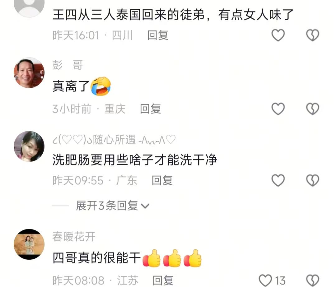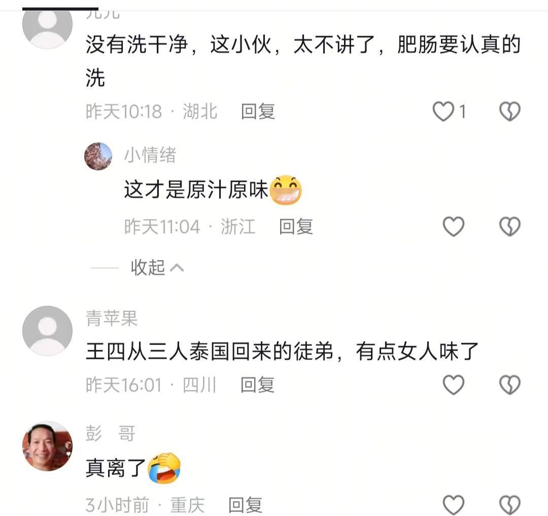 然后我翻评论区,直接给我整笑了。有人还在纠结肥肠洗没洗干净,有人突然扯“从泰国回来的徒弟怎么有点女人味”,还有人吵起了四哥的婚姻,更有人问“怎么不拍建大别墅了”。嗯,怎么说呢,可能是吧,大家的关注点真的永远不在正地方。