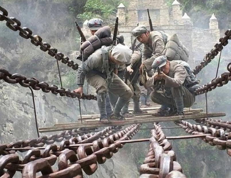 22名勇士组成突击队,抱着铁索迎着密集的子弹,一寸一寸往前爬,子弹打在铁链上,火星四溅,不断有战士中弹,坠入滚滚江水中,但后面的人没有退缩,他们一边冲锋,一边铺上门板,为大部队开辟通路。