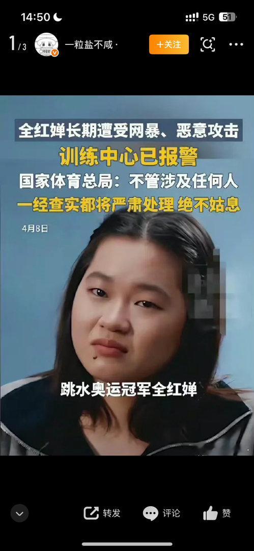 赛场之外的全红婵,性格低调内敛、单纯善良,对待队友真诚友善,面对媒体镜头谦逊有礼,从不刻意炒作博关注,也没有任何负面新闻与不当言行。即便面对外界的争议与质疑,她也始终专注于自身训练,不被舆论干扰,默默扛下所有压力,只希望能在赛场上跳出更好的成绩。然而令人心寒的是,这样一位一心追梦、全力拼搏的年轻运动员,却长期遭受无端的网络暴力、恶意剪辑、断章取义式抹黑,部分网友和自媒体肆意煽动对立、散播谣言,将莫须有的指责与谩骂强加在她身上,给她的心理和日常训练生活带来了极大的困扰。